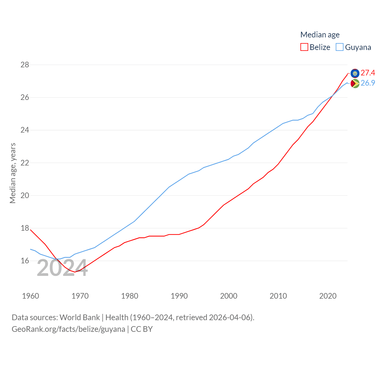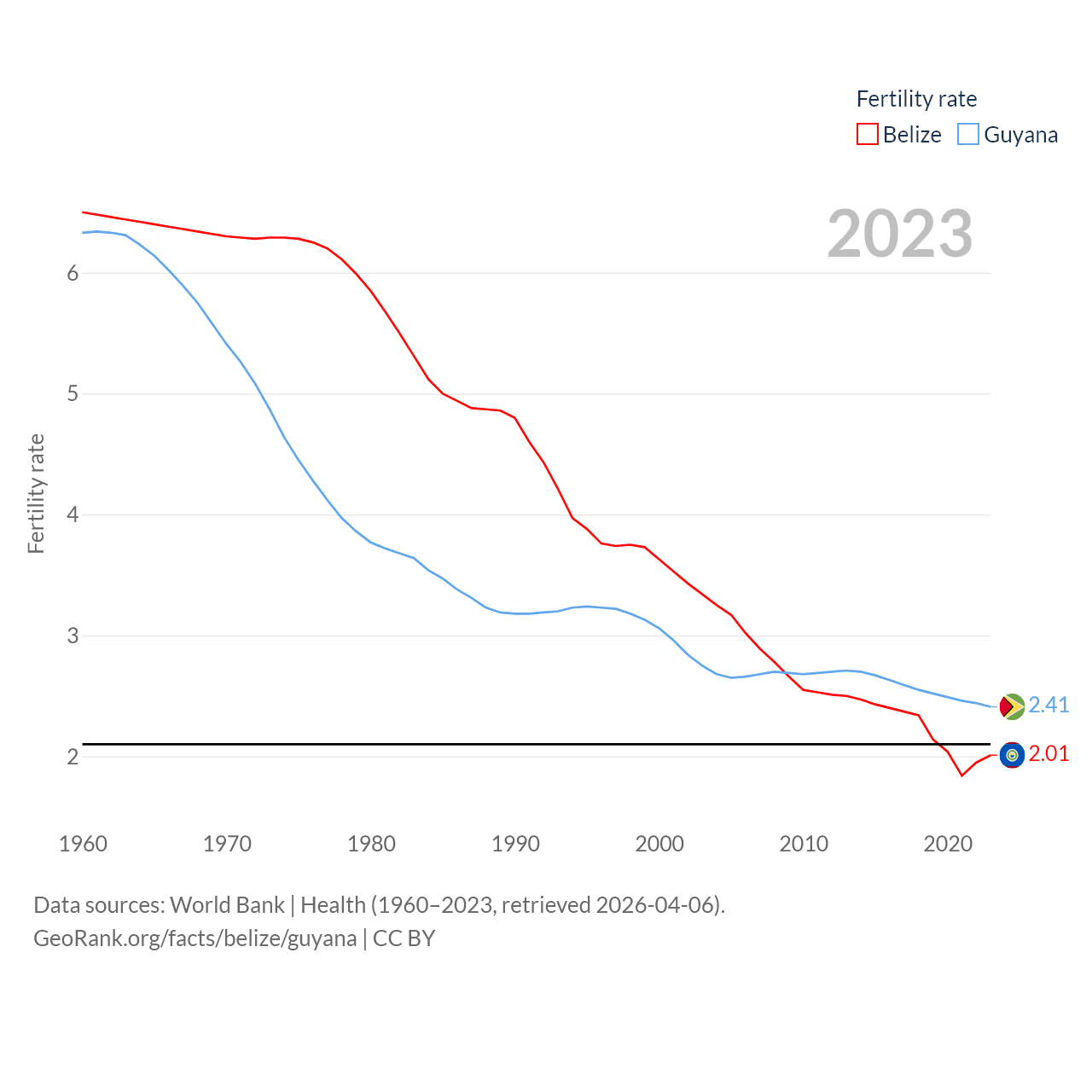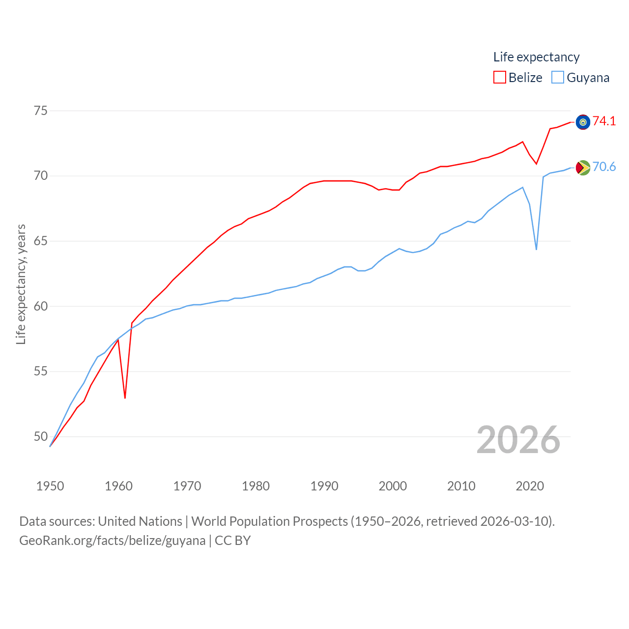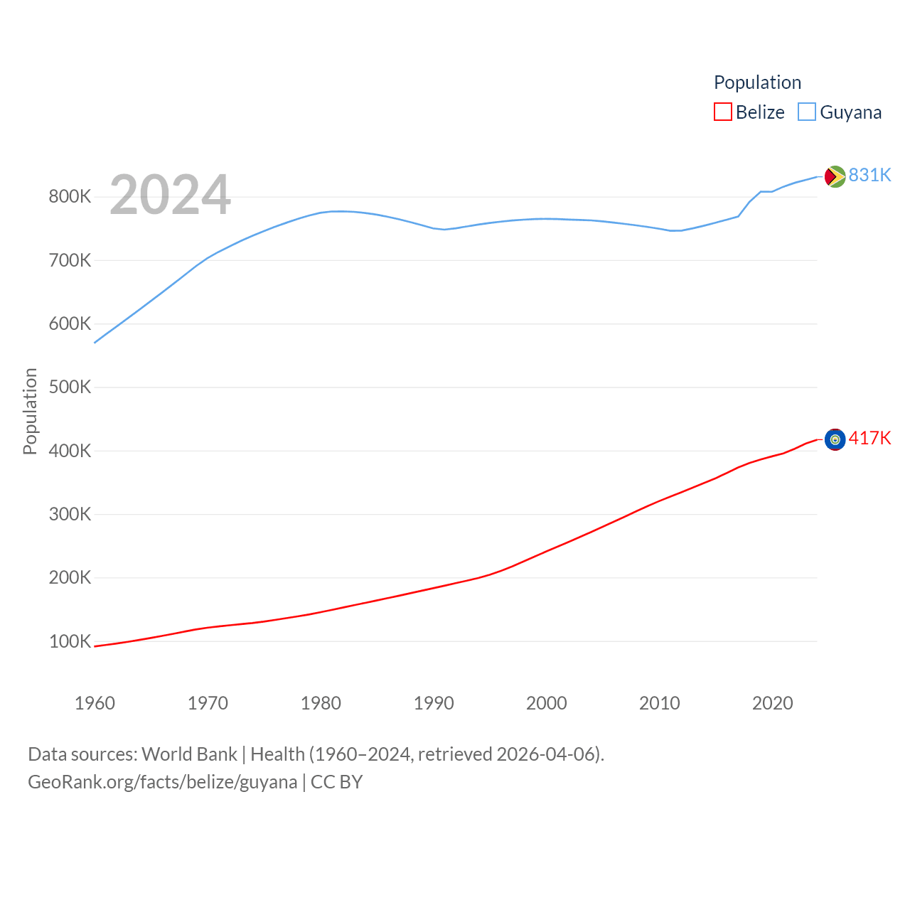 Belize has a population of 417K (ranked 171/197), compared with 831K in Guyana (ranked 161/197). Belize's land area is 8,807 sq mi versus 81,522 sq mi for Guyana (ranked 148th vs. 82nd).
