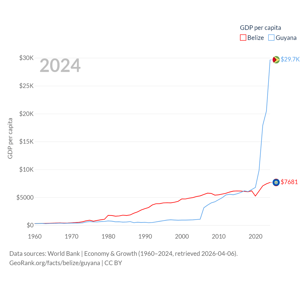 By GDP, Belize ranks 168/197 ($3.2B) and Guyana ranks 120/197 ($24.7B). By GDP per capita, Belize ranks 98/197 ($7,681), while Guyana ranks 41/197 ($29,675).