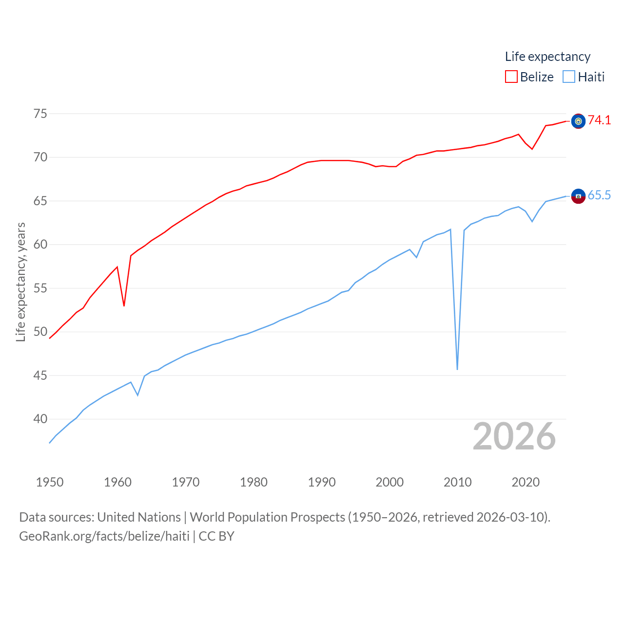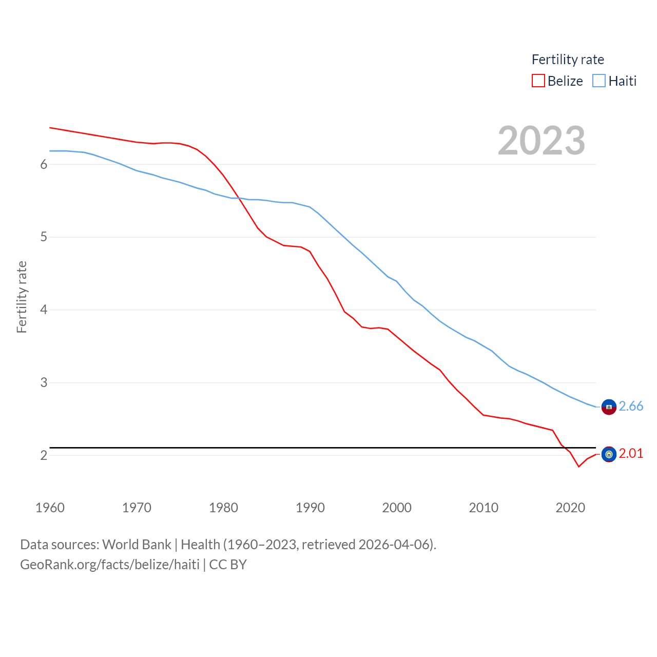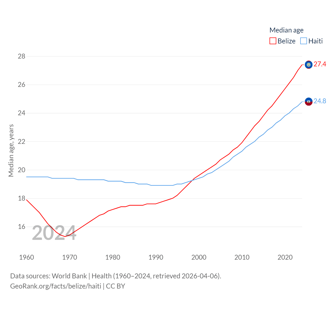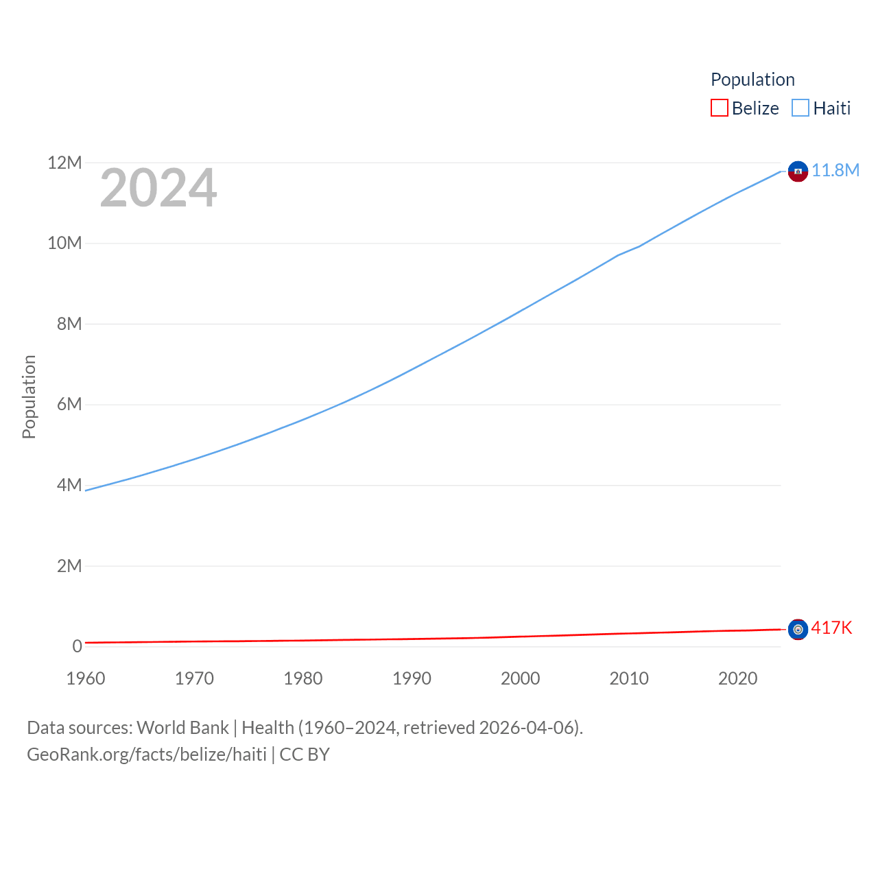 Belize has a population of 417K (ranked 171/197), compared with 11.8M in Haiti (ranked 83/197). Belize's land area is 8,807 sq mi versus 10,641 sq mi for Haiti (ranked 148th vs. 142nd).