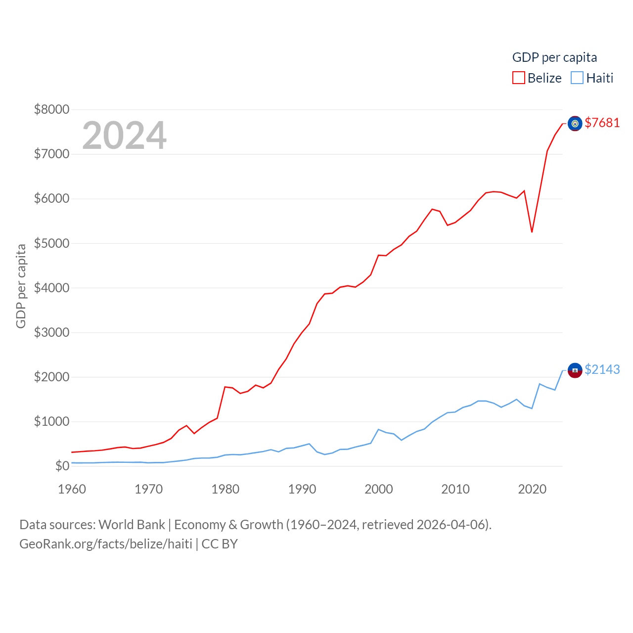 By GDP, Belize ranks 168/197 ($3.2B) and Haiti ranks 117/197 ($25.2B). By GDP per capita, Belize ranks 98/197 ($7,681), while Haiti ranks 153/197 ($2,143).