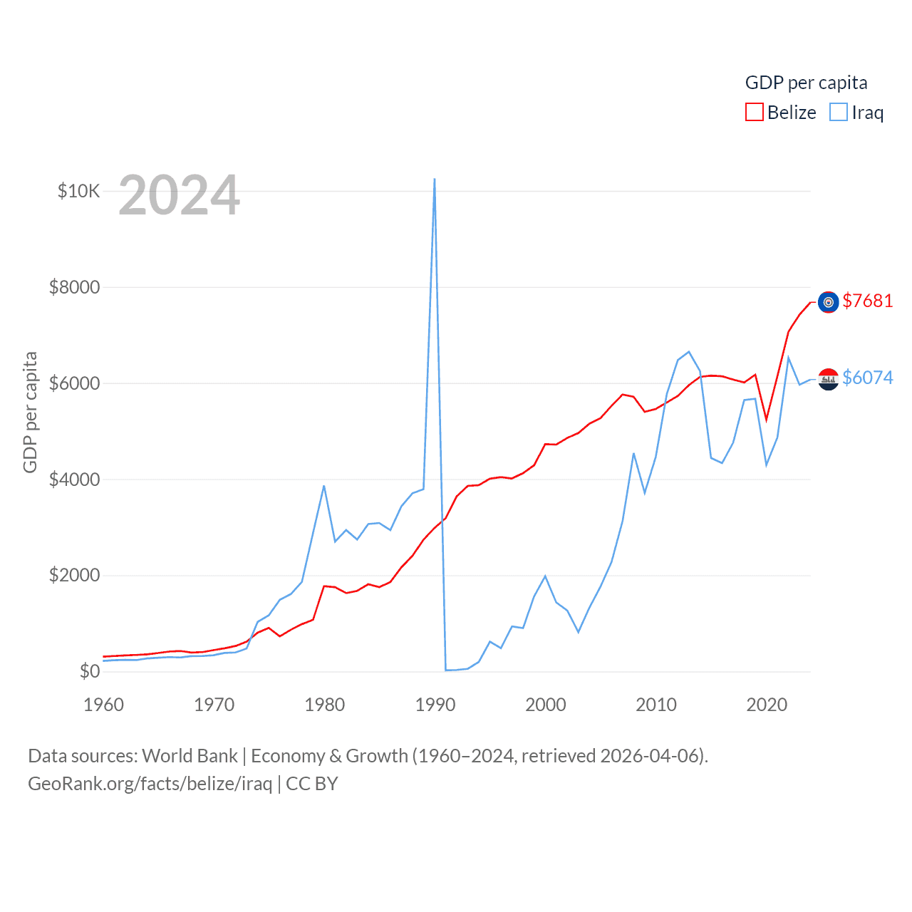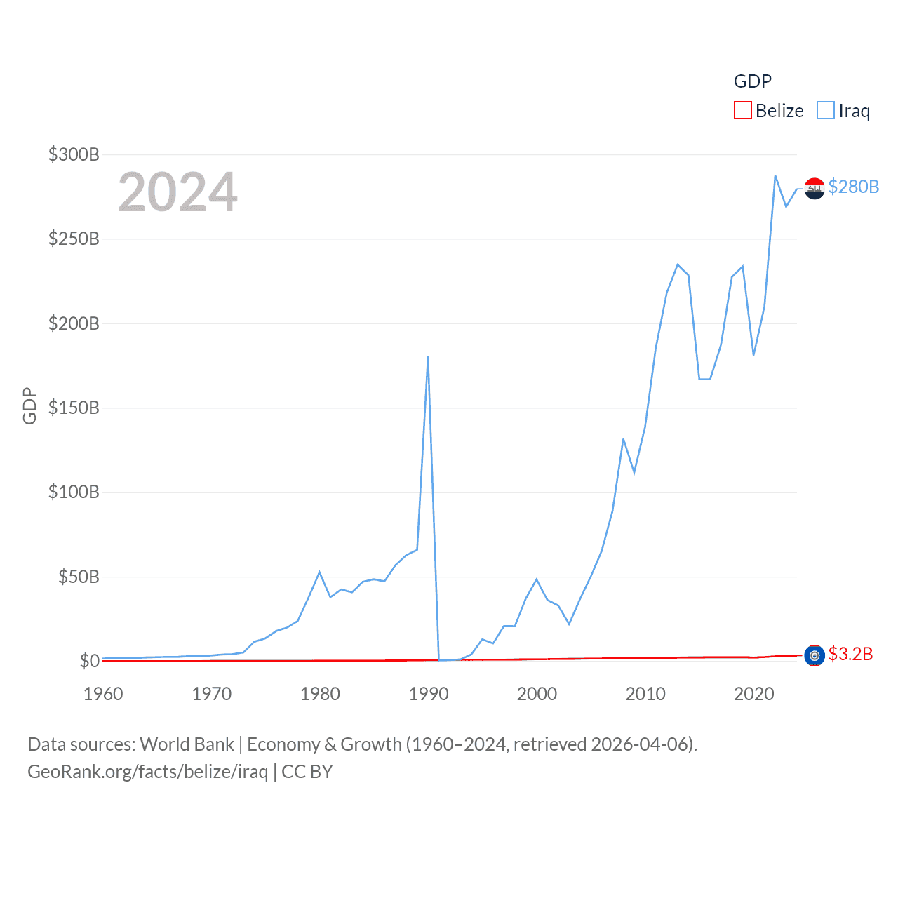 By GDP, Belize ranks 168/197 ($3.2B) and Iraq ranks 50/197 ($280B). By GDP per capita, Belize ranks 98/197 ($7,681), while Iraq ranks 113/197 ($6,074).