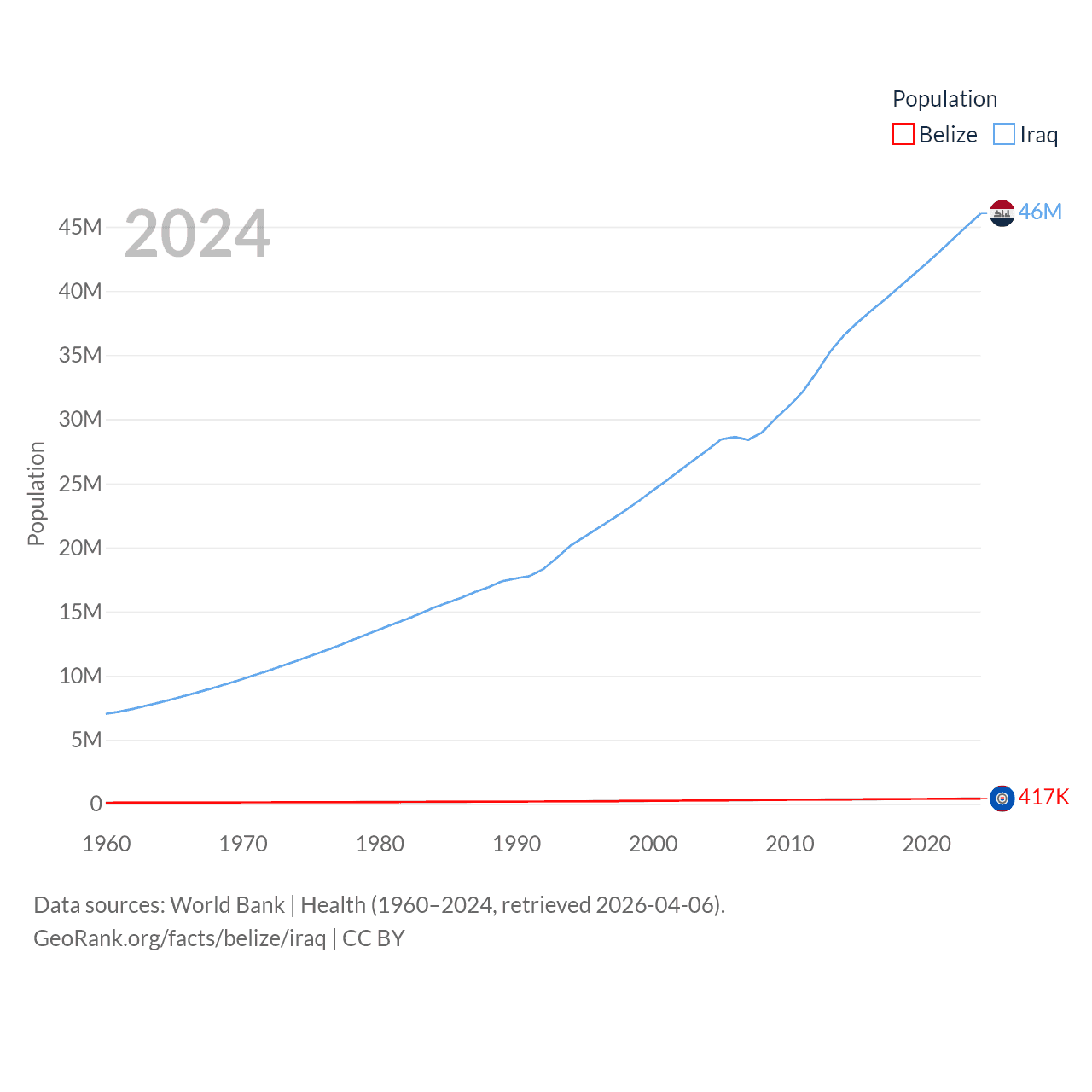 Belize has a population of 417K (ranked 171/197), compared with 46M in Iraq (ranked 34/197). Belize's land area is 8,807 sq mi versus 167,619 sq mi for Iraq (ranked 148th vs. 57th).