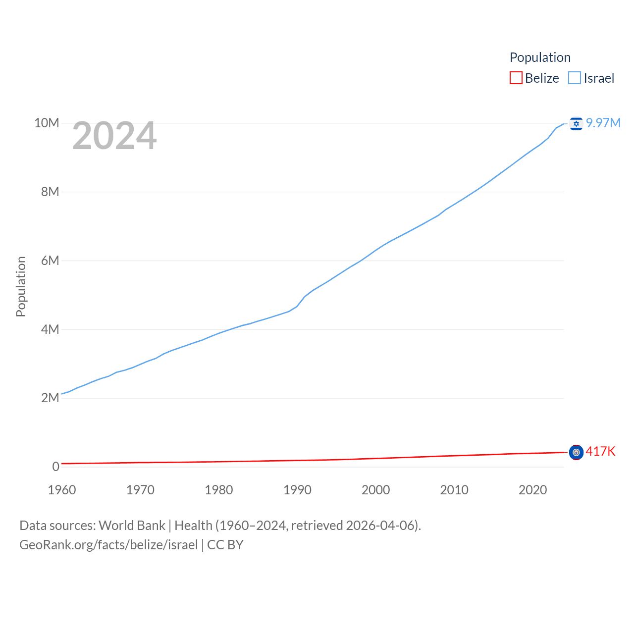Belize has a population of 417K (ranked 171/197), compared with 9.97M in Israel (ranked 96/197). Belize's land area is 8,807 sq mi versus 8,355 sq mi for Israel (ranked 148th vs. 149th).