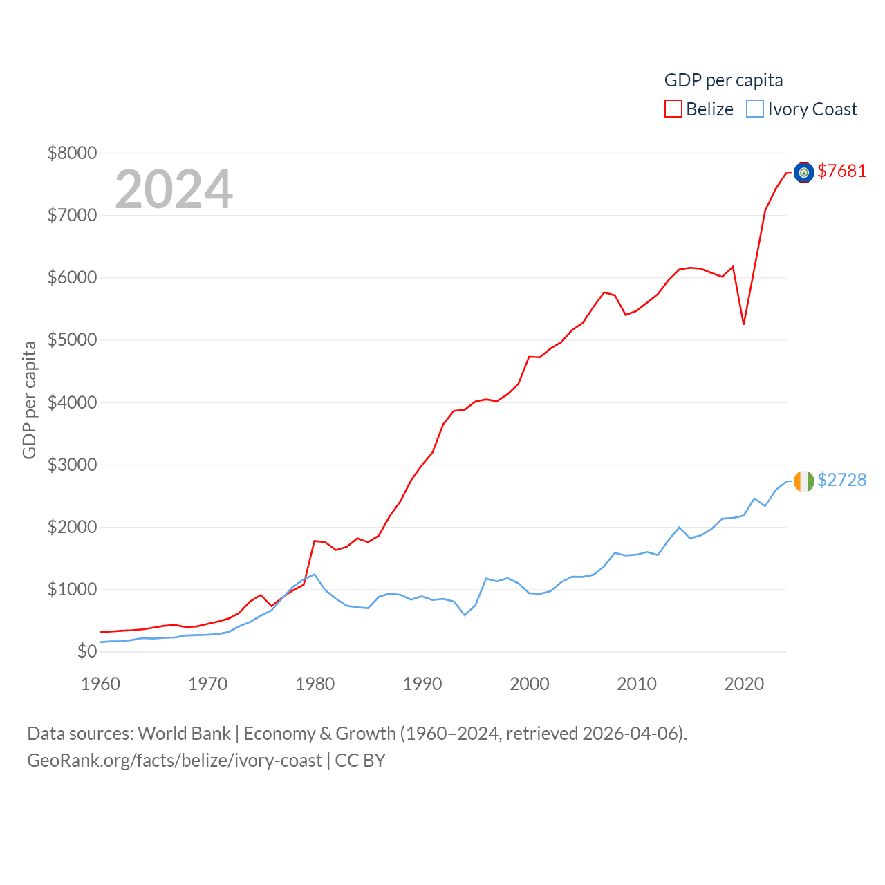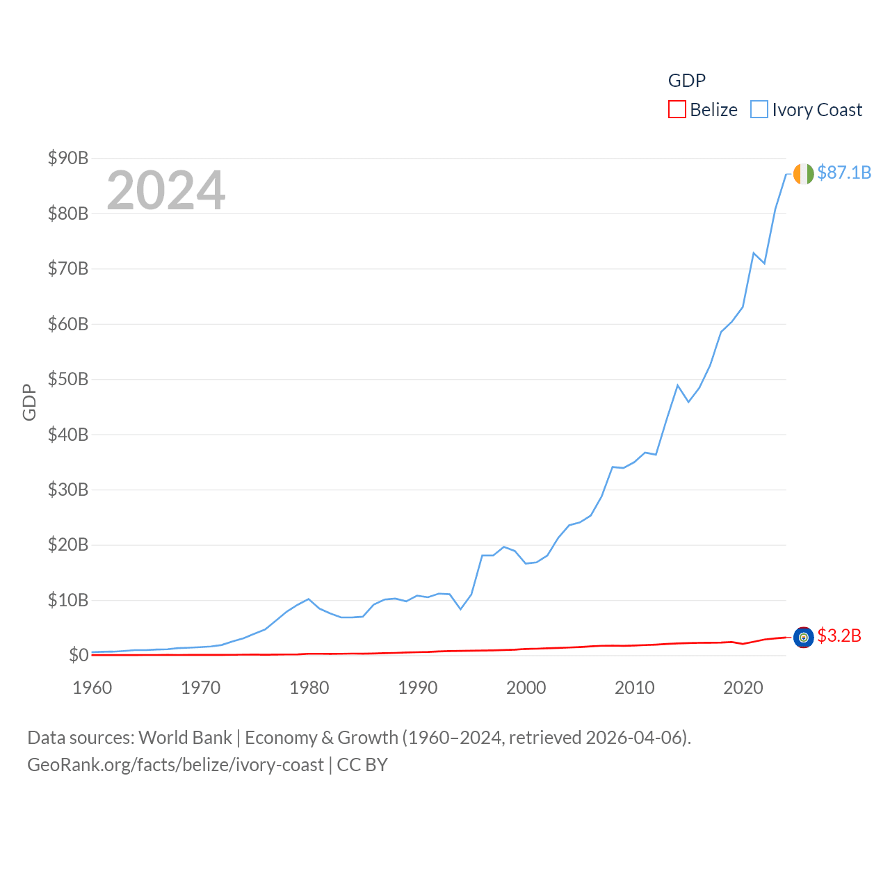 By GDP, Belize ranks 168/197 ($3.2B) and Ivory Coast ranks 77/197 ($87.1B). By GDP per capita, Belize ranks 98/197 ($7,681), while Ivory Coast ranks 142/197 ($2,728).