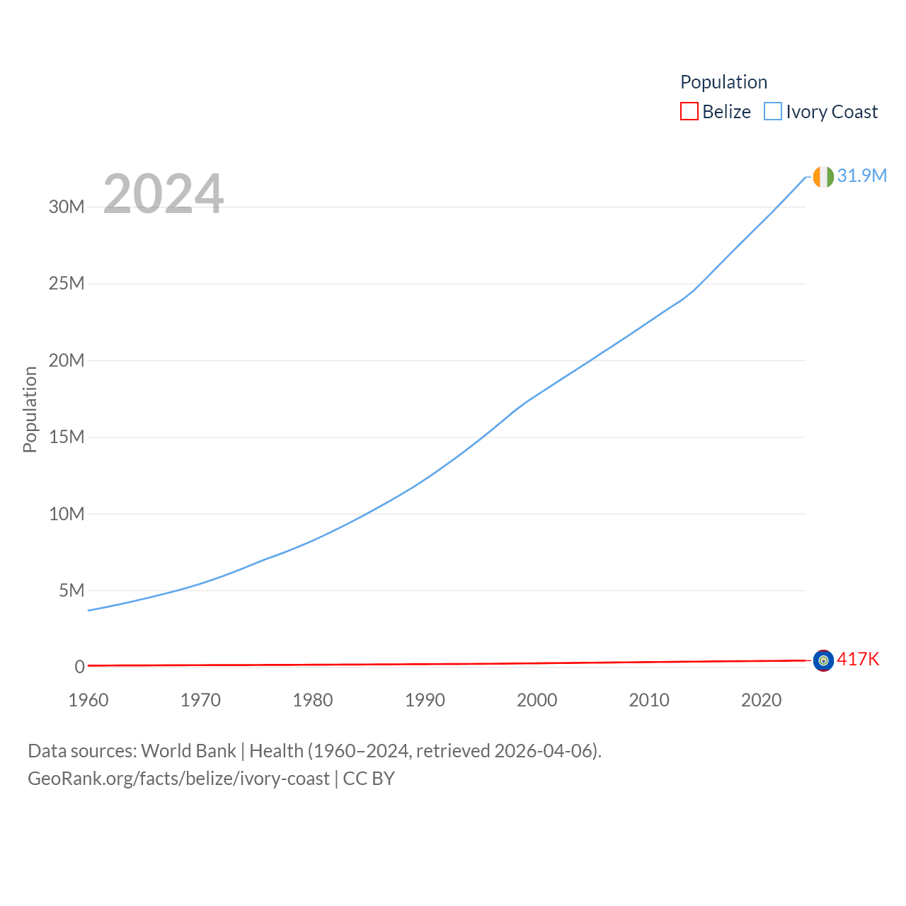 Belize has a population of 417K (ranked 171/197), compared with 31.9M in Ivory Coast (ranked 50/197). Belize's land area is 8,807 sq mi versus 122,780 sq mi for Ivory Coast (ranked 148th vs. 66th).
