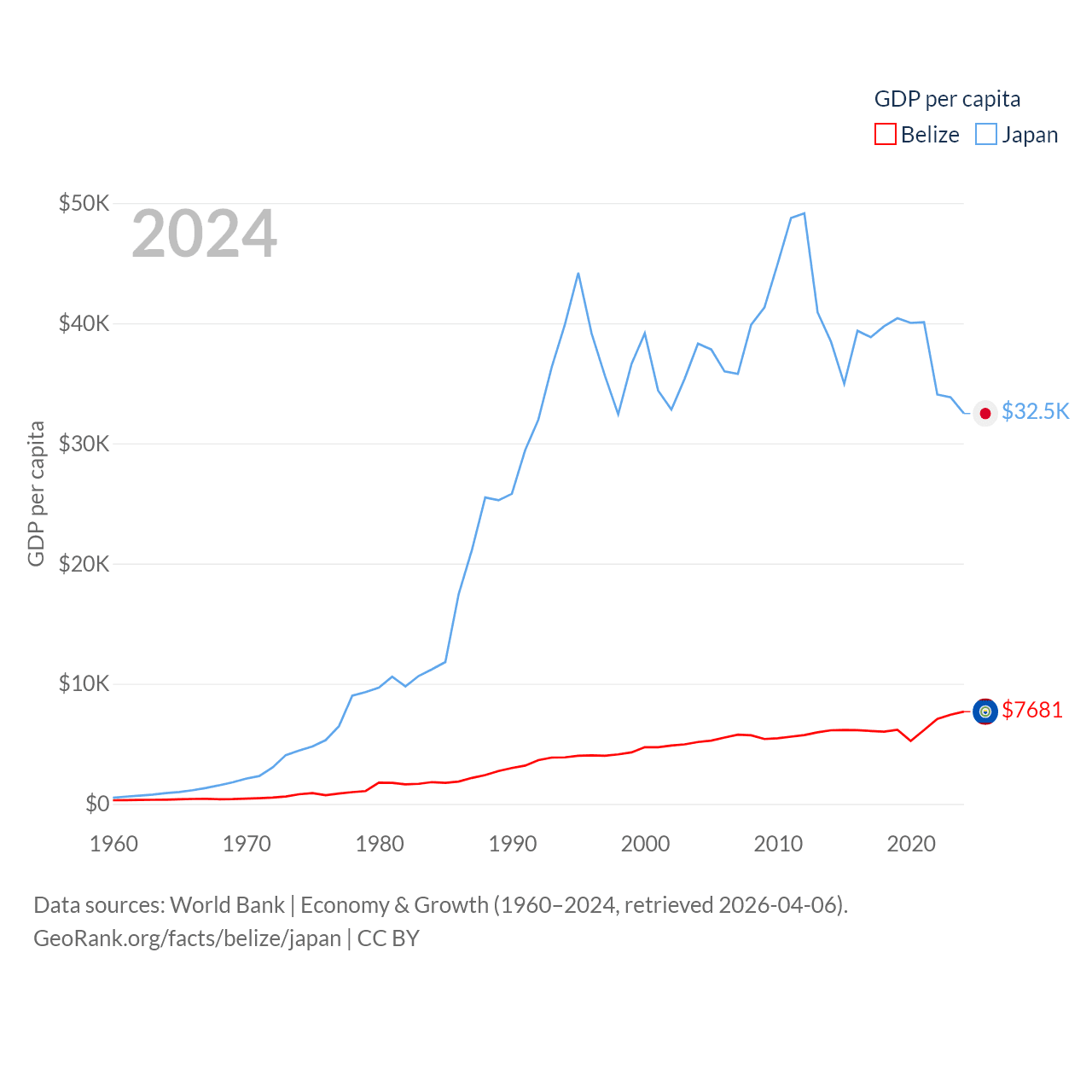 By GDP, Belize ranks 168/197 ($3.2B) and Japan ranks 4/197 ($4.03T). By GDP per capita, Belize ranks 98/197 ($7,681), while Japan ranks 38/197 ($32,487).