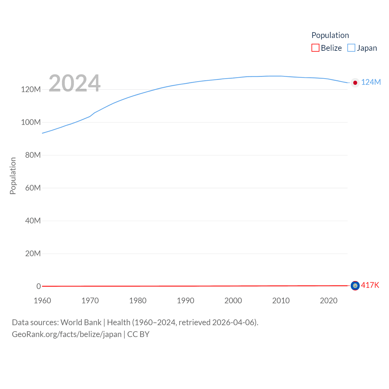 Belize has a population of 417K (ranked 171/197), compared with 124M in Japan (ranked 12/197). Belize's land area is 8,807 sq mi versus 140,761 sq mi for Japan (ranked 148th vs. 61st).