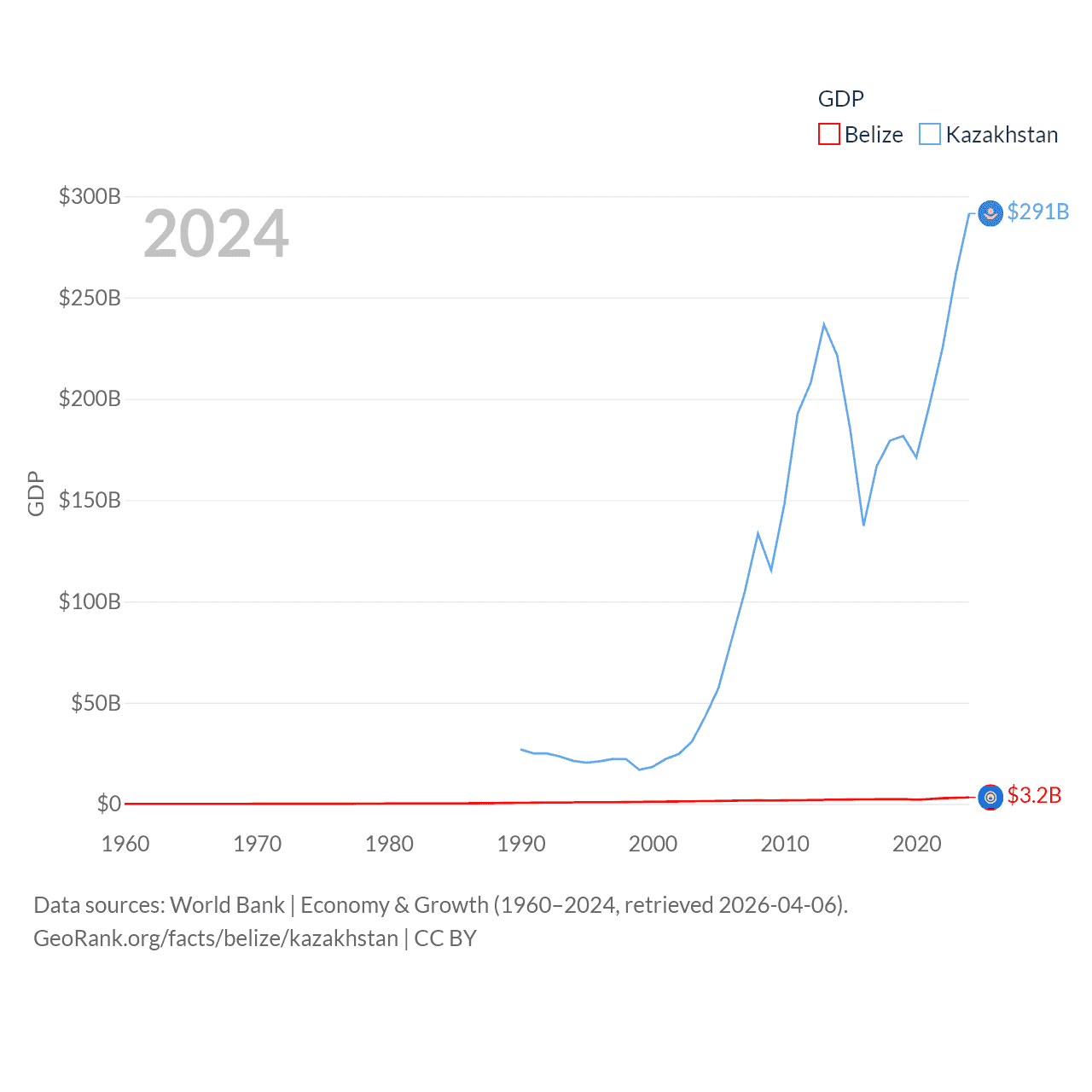 By GDP, Belize ranks 168/197 ($3.2B) and Kazakhstan ranks 48/197 ($291B). By GDP per capita, Belize ranks 98/197 ($7,681), while Kazakhstan ranks 71/197 ($14,155).
