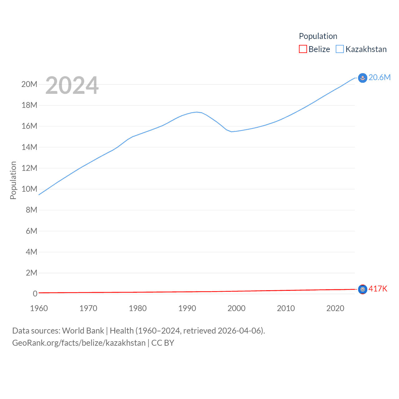 Belize has a population of 417K (ranked 171/197), compared with 20.6M in Kazakhstan (ranked 64/197). Belize's land area is 8,807 sq mi versus 1,042,360 sq mi for Kazakhstan (ranked 148th vs. 9th).