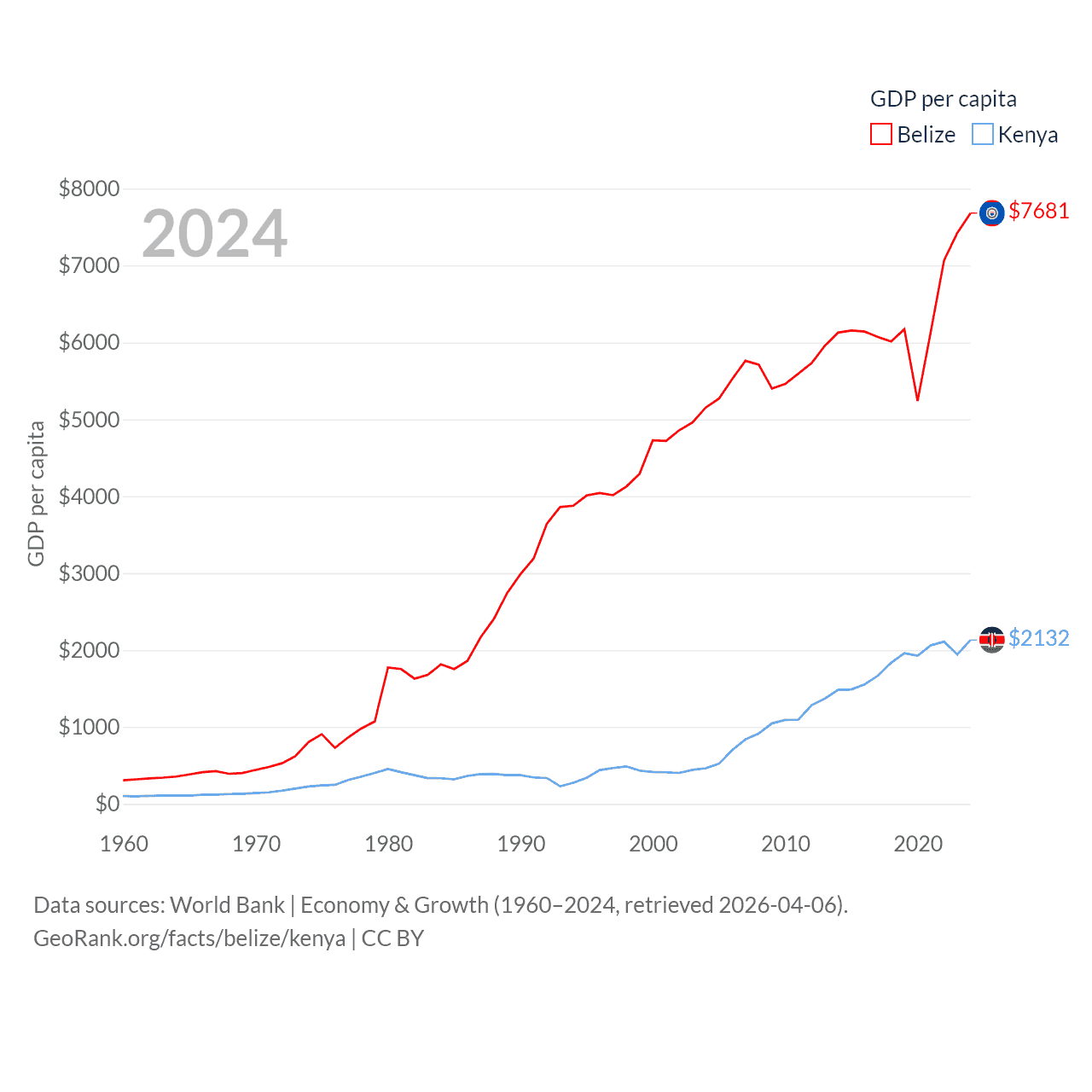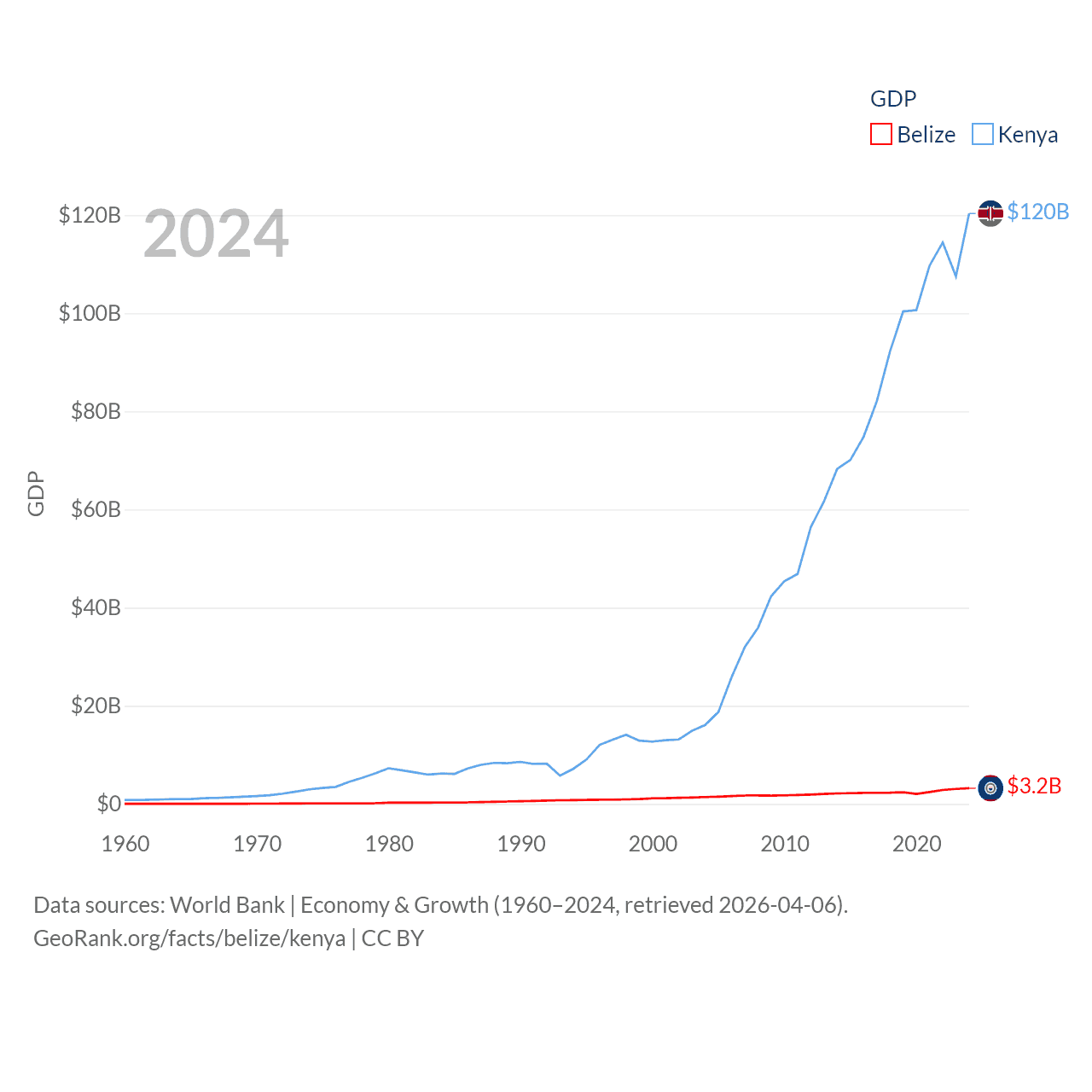 By GDP, Belize ranks 168/197 ($3.2B) and Kenya ranks 64/197 ($120B). By GDP per capita, Belize ranks 98/197 ($7,681), while Kenya ranks 154/197 ($2,132).