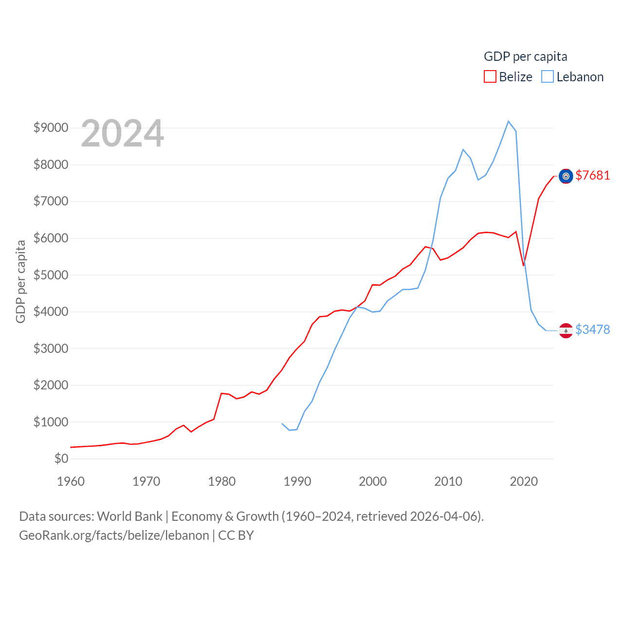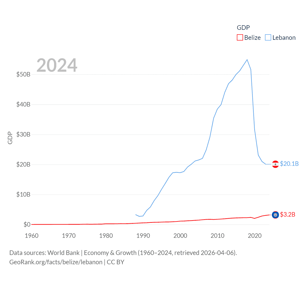 By GDP, Belize ranks 168/197 ($3.2B) and Lebanon ranks 128/197 ($20.1B). By GDP per capita, Belize ranks 98/197 ($7,681), while Lebanon ranks 135/197 ($3,478).