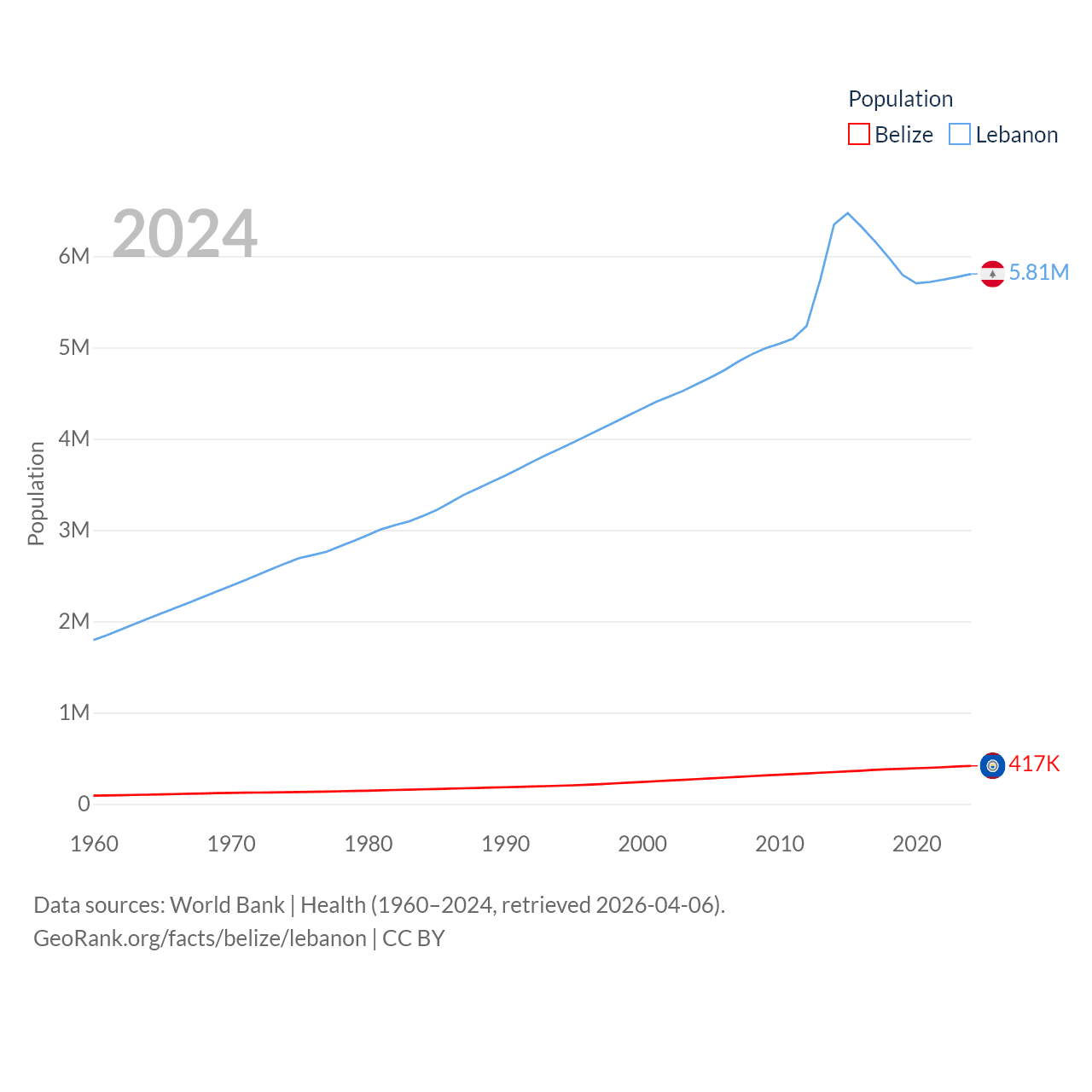 Belize has a population of 417K (ranked 171/197), compared with 5.81M in Lebanon (ranked 115/197). Belize's land area is 8,807 sq mi versus 3,950 sq mi for Lebanon (ranked 148th vs. 160th).