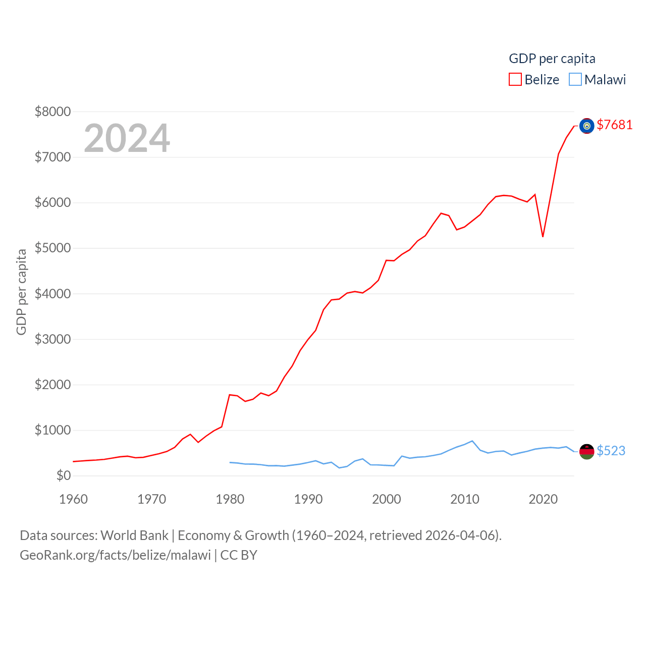 By GDP, Belize ranks 168/197 ($3.2B) and Malawi ranks 151/197 ($11.3B). By GDP per capita, Belize ranks 98/197 ($7,681), while Malawi ranks 194/197 ($523).