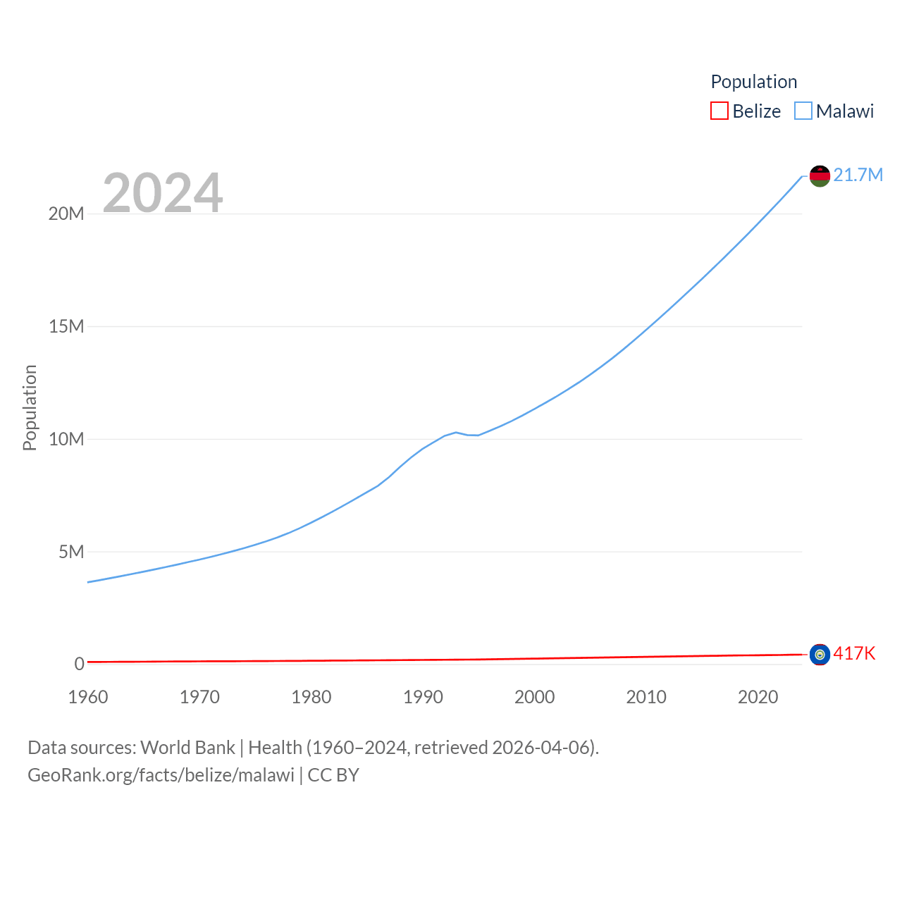 Belize has a population of 417K (ranked 171/197), compared with 21.7M in Malawi (ranked 62/197). Belize's land area is 8,807 sq mi versus 36,402 sq mi for Malawi (ranked 148th vs. 107th).