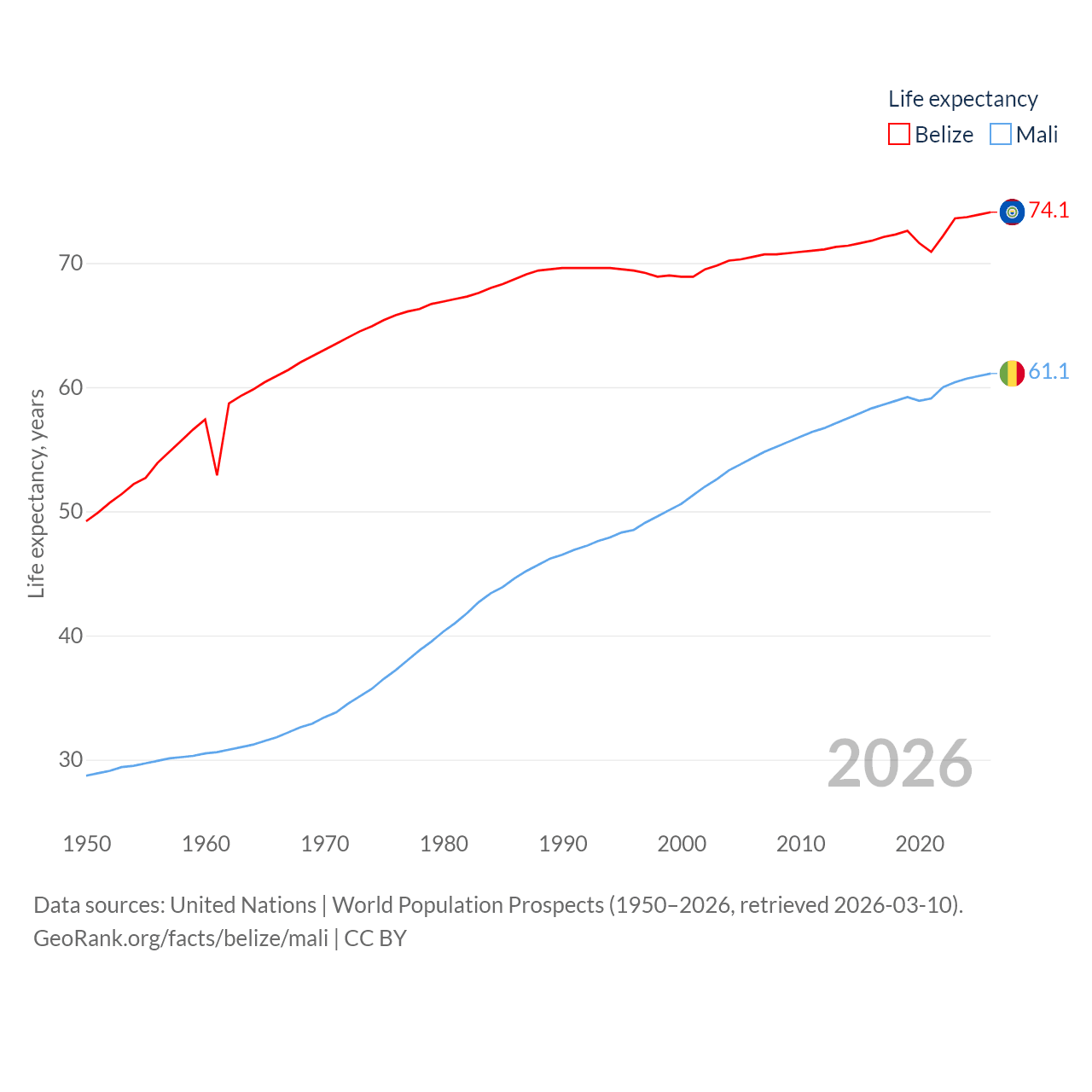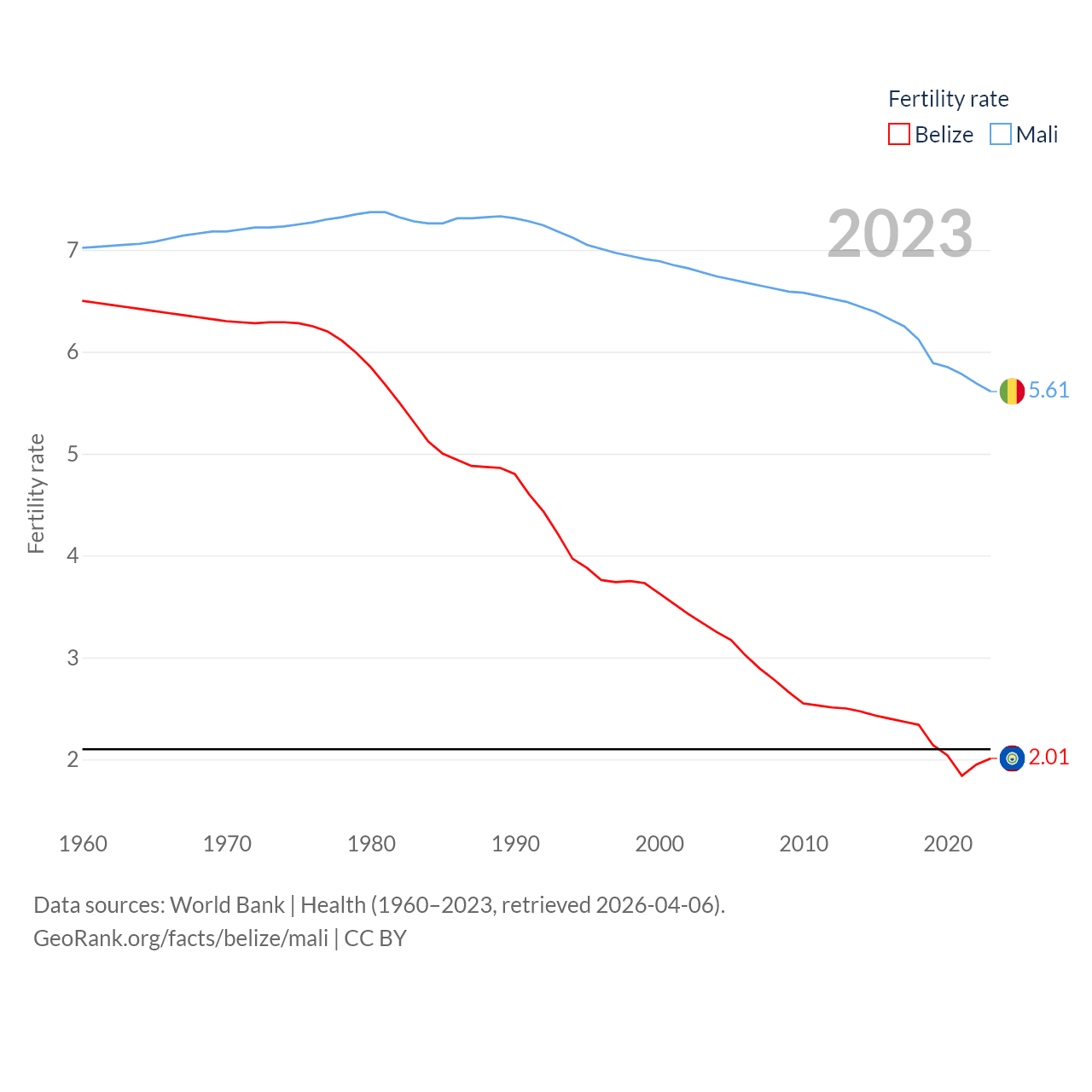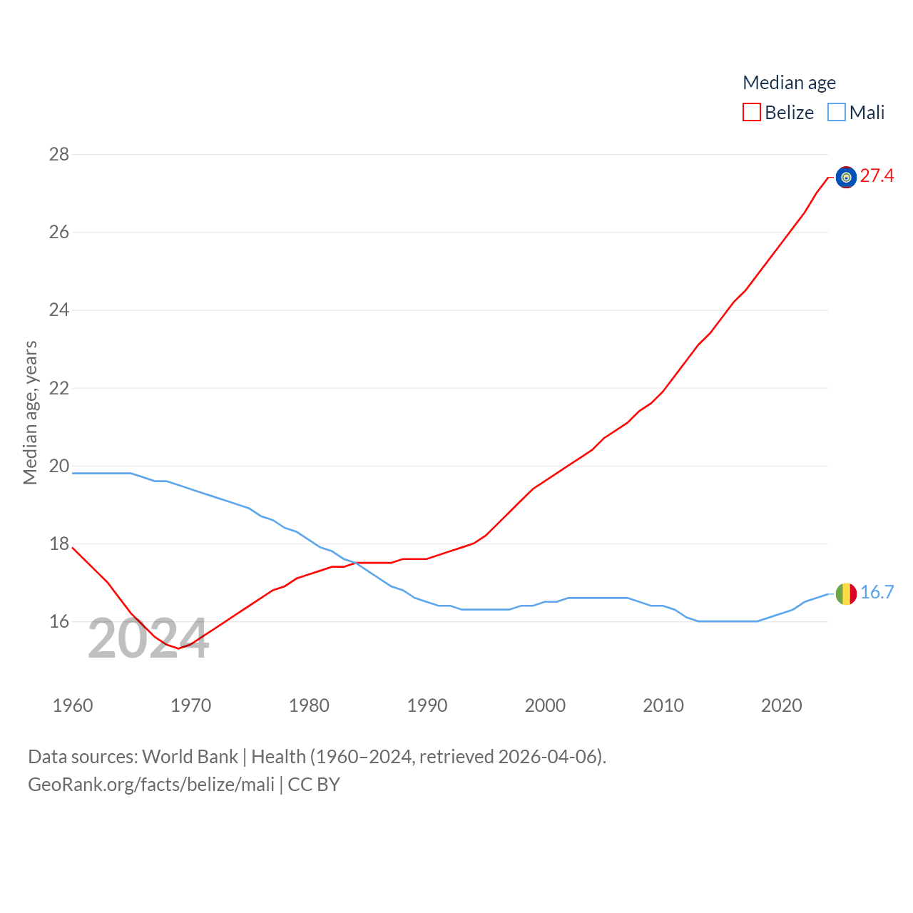 Belize has a population of 417K (ranked 171/197), compared with 24.5M in Mali (ranked 58/197). Belize's land area is 8,807 sq mi versus 471,118 sq mi for Mali (ranked 148th vs. 23rd).
