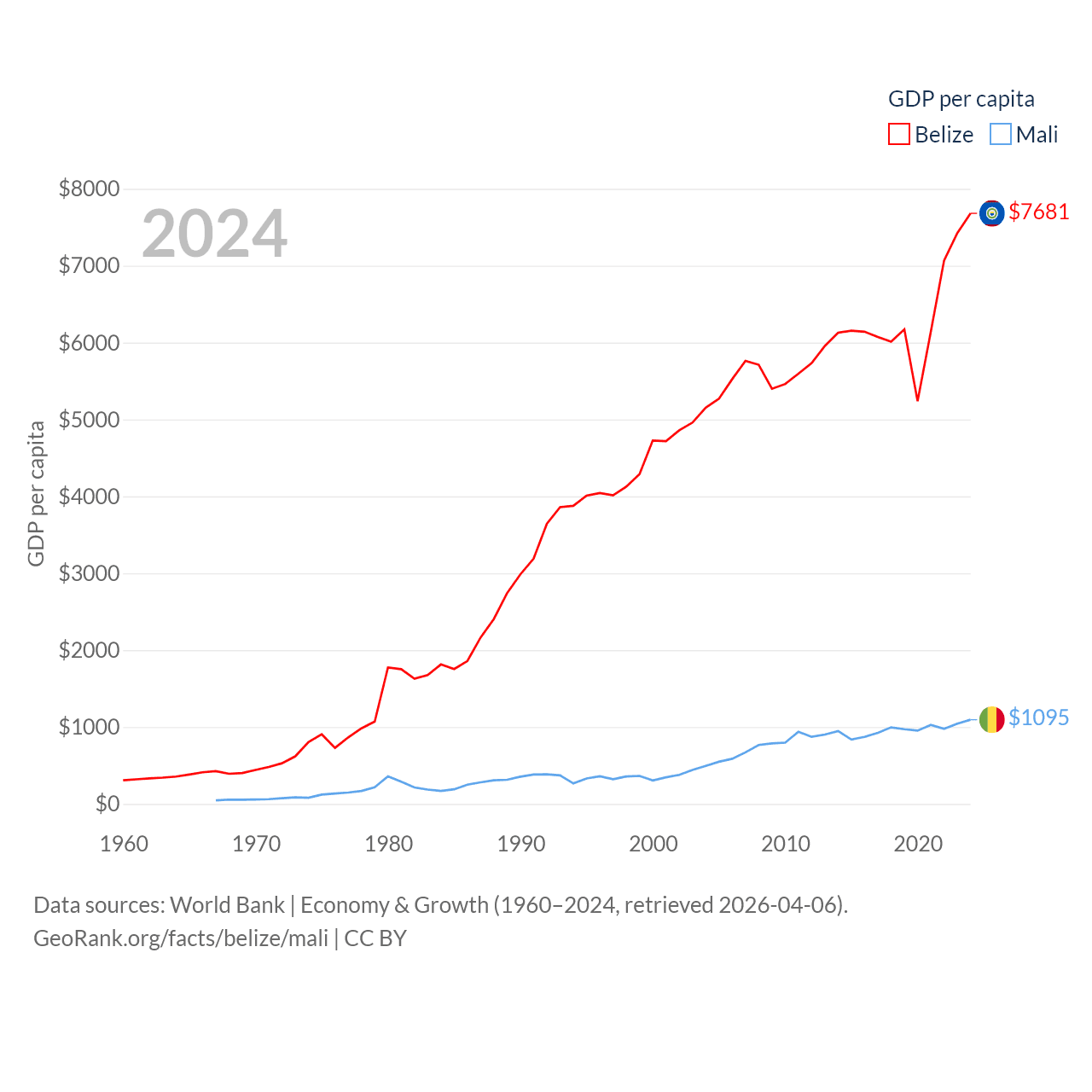 By GDP, Belize ranks 168/197 ($3.2B) and Mali ranks 113/197 ($26.8B). By GDP per capita, Belize ranks 98/197 ($7,681), while Mali ranks 173/197 ($1,095).