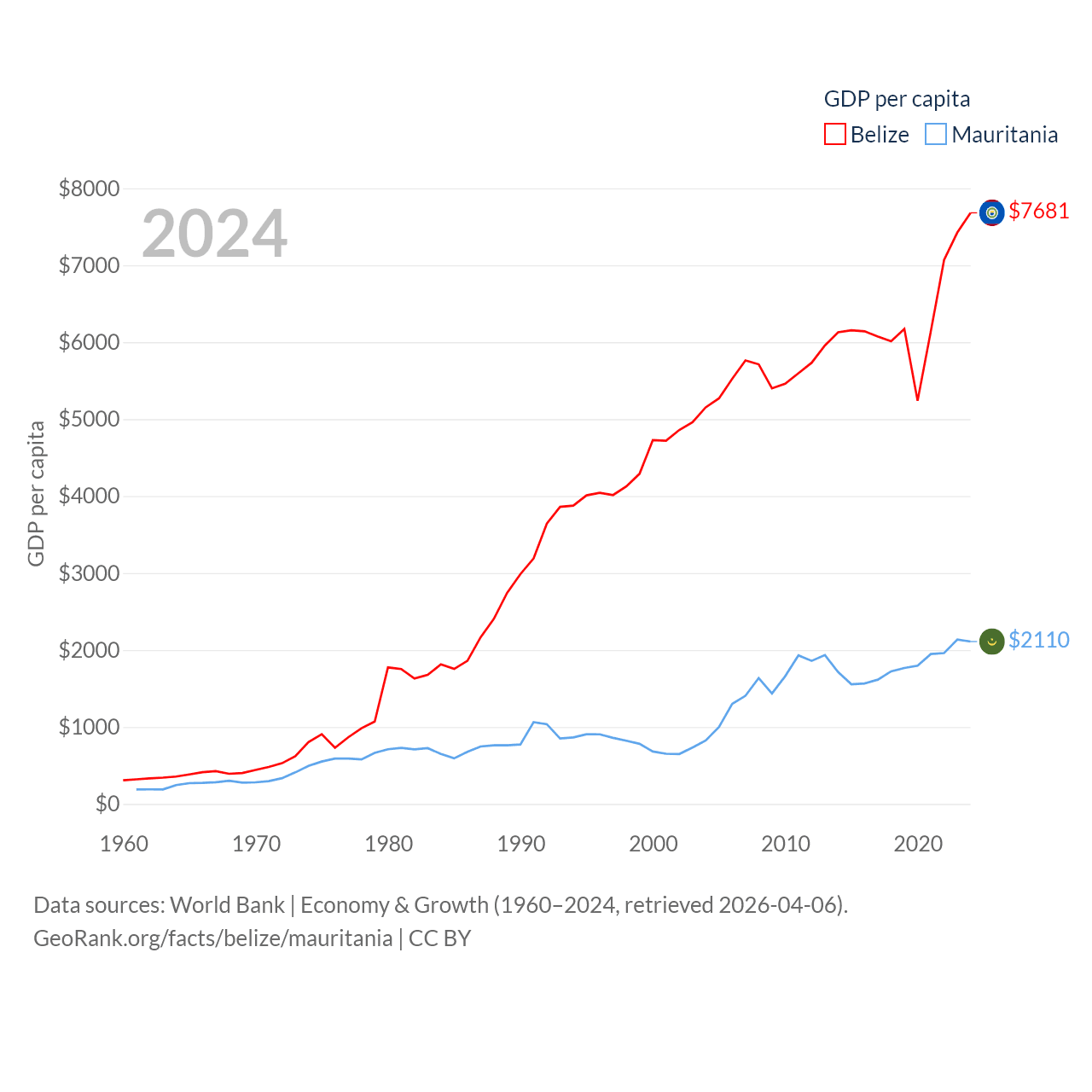 By GDP, Belize ranks 168/197 ($3.2B) and Mauritania ranks 153/197 ($10.9B). By GDP per capita, Belize ranks 98/197 ($7,681), while Mauritania ranks 156/197 ($2,110).