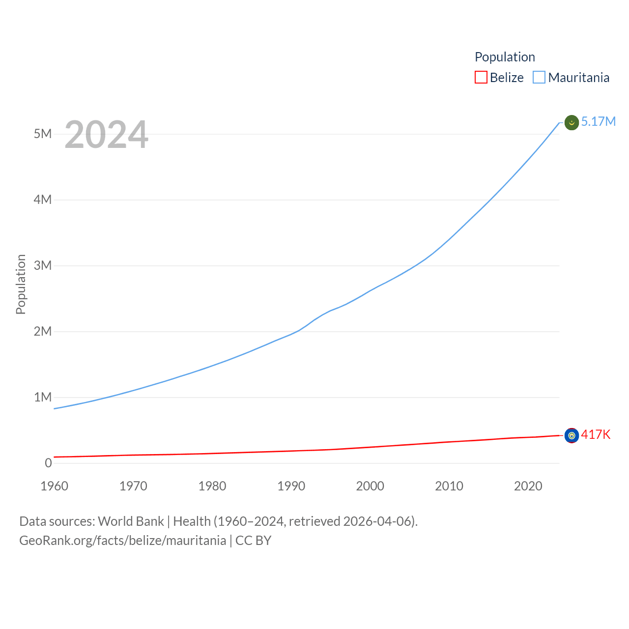 Belize has a population of 417K (ranked 171/197), compared with 5.17M in Mauritania (ranked 125/197). Belize's land area is 8,807 sq mi versus 397,955 sq mi for Mauritania (ranked 148th vs. 28th).