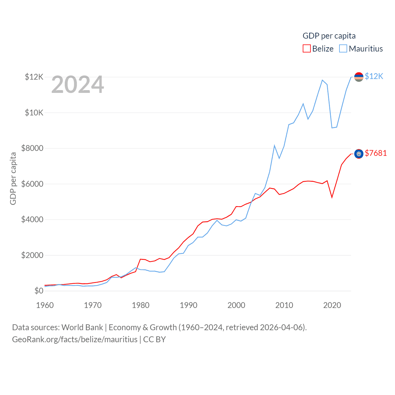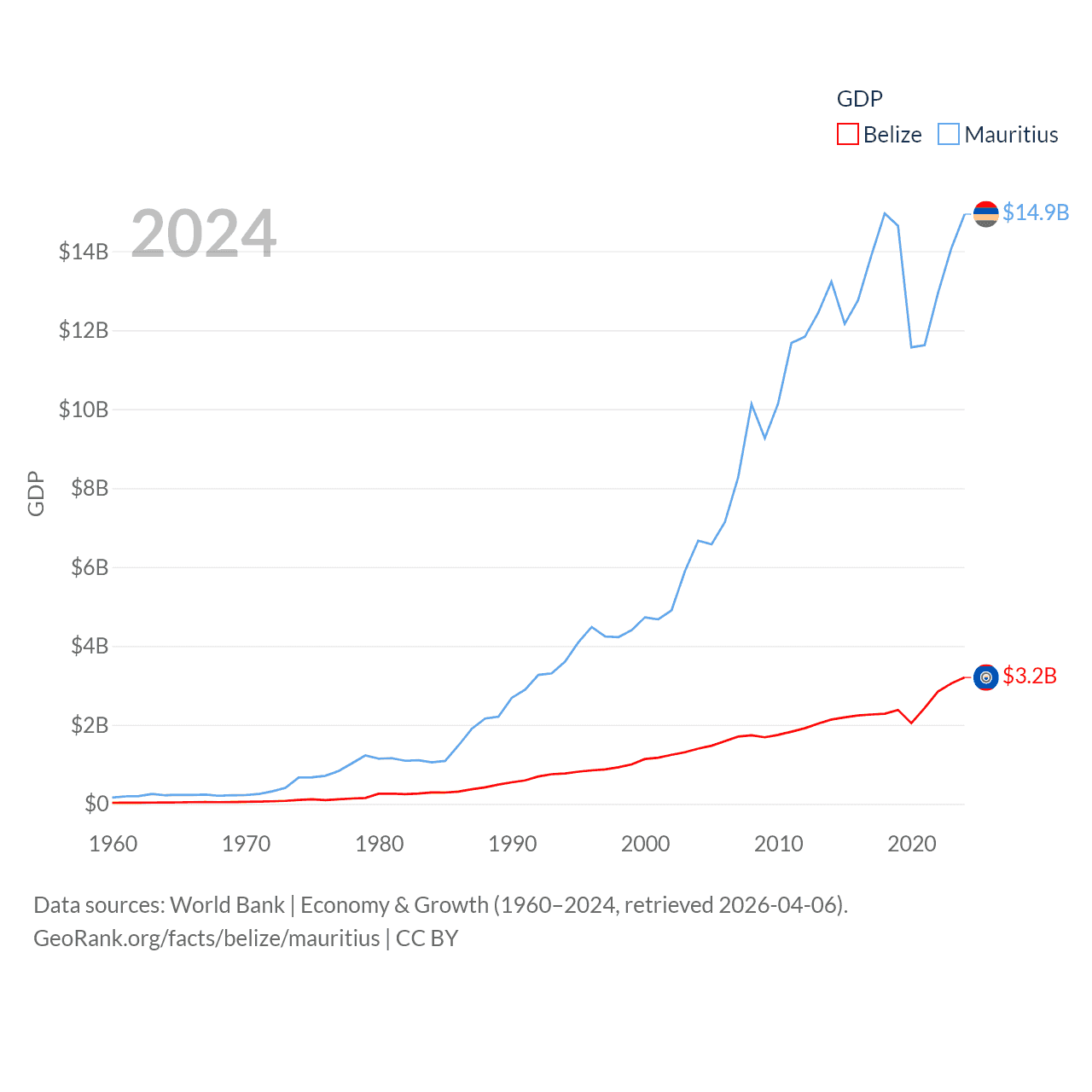 By GDP, Belize ranks 168/197 ($3.2B) and Mauritius ranks 143/197 ($14.9B). By GDP per capita, Belize ranks 98/197 ($7,681), while Mauritius ranks 78/197 ($11,991).