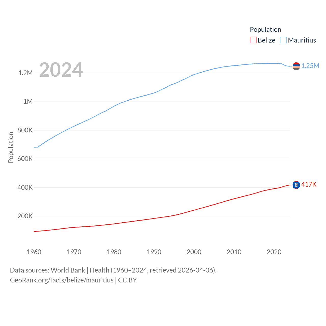 Belize has a population of 417K (ranked 171/197), compared with 1.25M in Mauritius (ranked 156/197). Belize's land area is 8,807 sq mi versus 771 sq mi for Mauritius (ranked 148th vs. 170th).