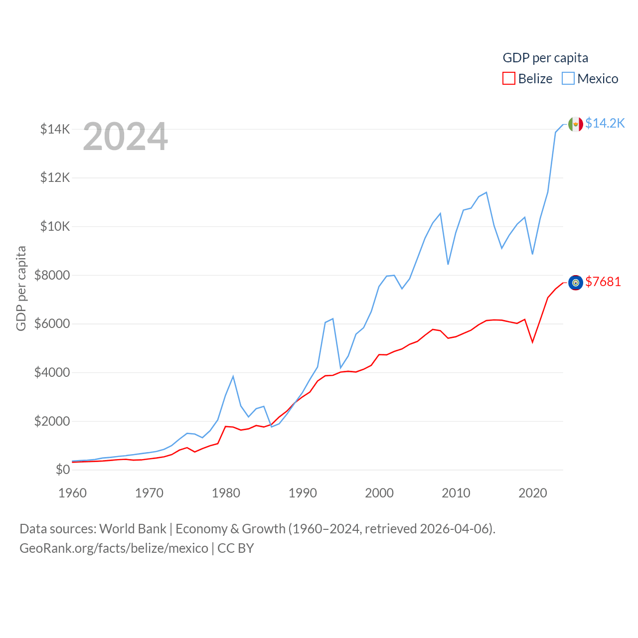 By GDP, Belize ranks 168/197 ($3.2B) and Mexico ranks 13/197 ($1.86T). By GDP per capita, Belize ranks 98/197 ($7,681), while Mexico ranks 69/197 ($14,186).