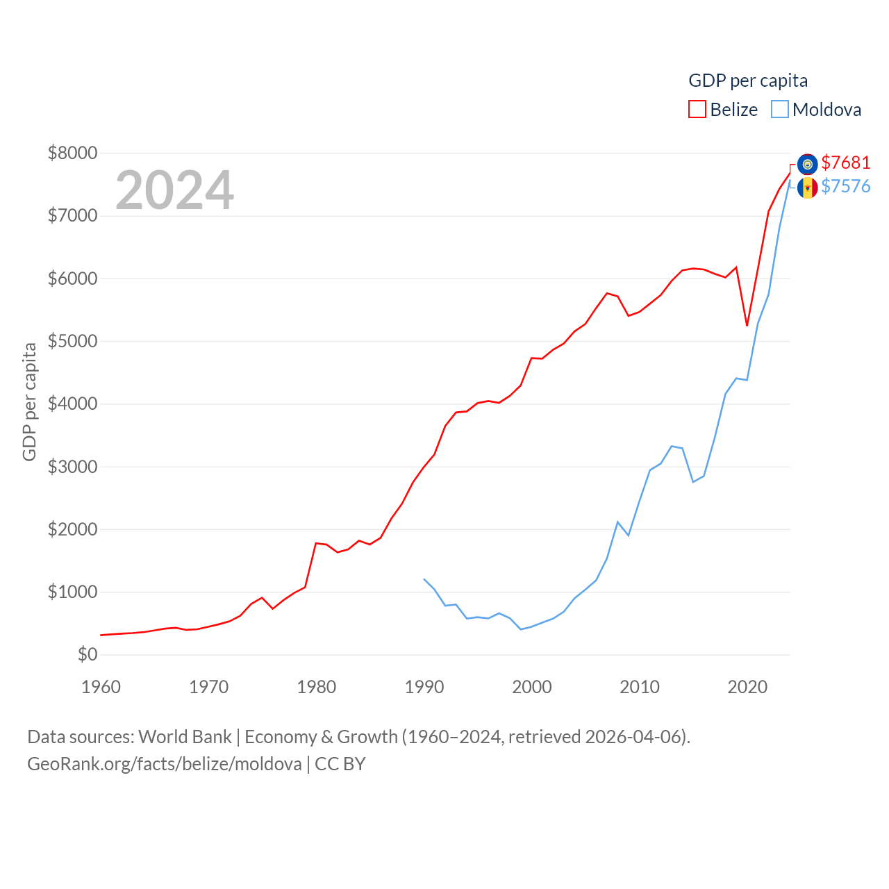 By GDP, Belize ranks 168/197 ($3.2B) and Moldova ranks 134/197 ($18.2B). By GDP per capita, Belize ranks 98/197 ($7,681), while Moldova ranks 99/197 ($7,576).