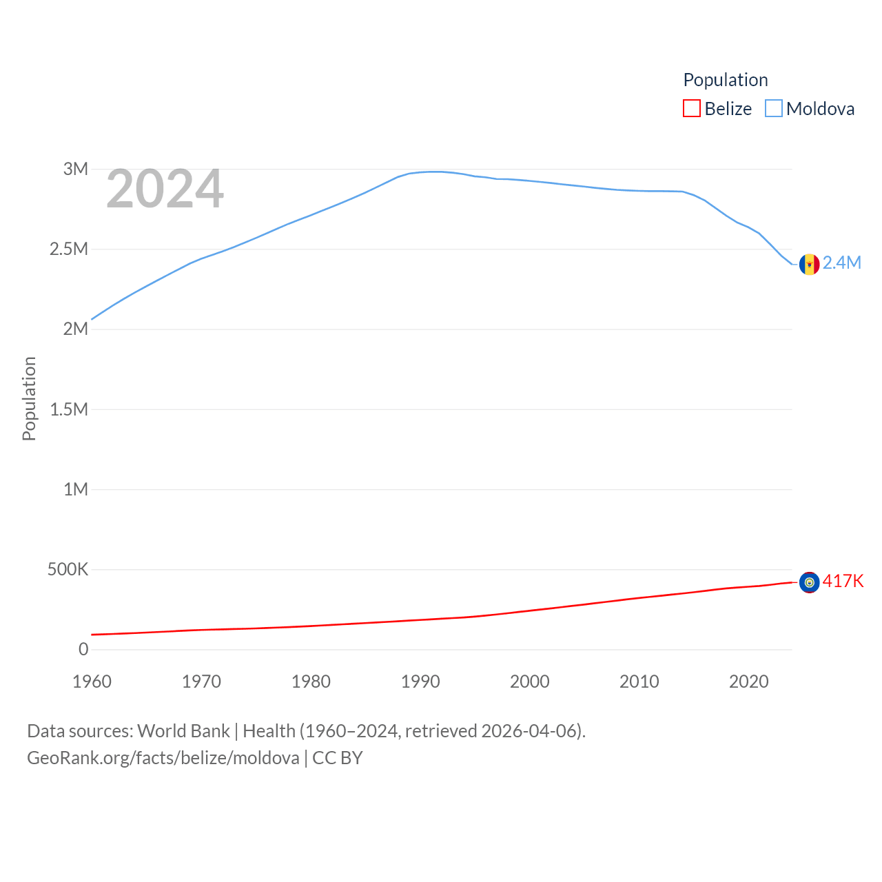 Belize has a population of 417K (ranked 171/197), compared with 2.4M in Moldova (ranked 143/197). Belize's land area is 8,807 sq mi versus 12,714 sq mi for Moldova (ranked 148th vs. 135th).