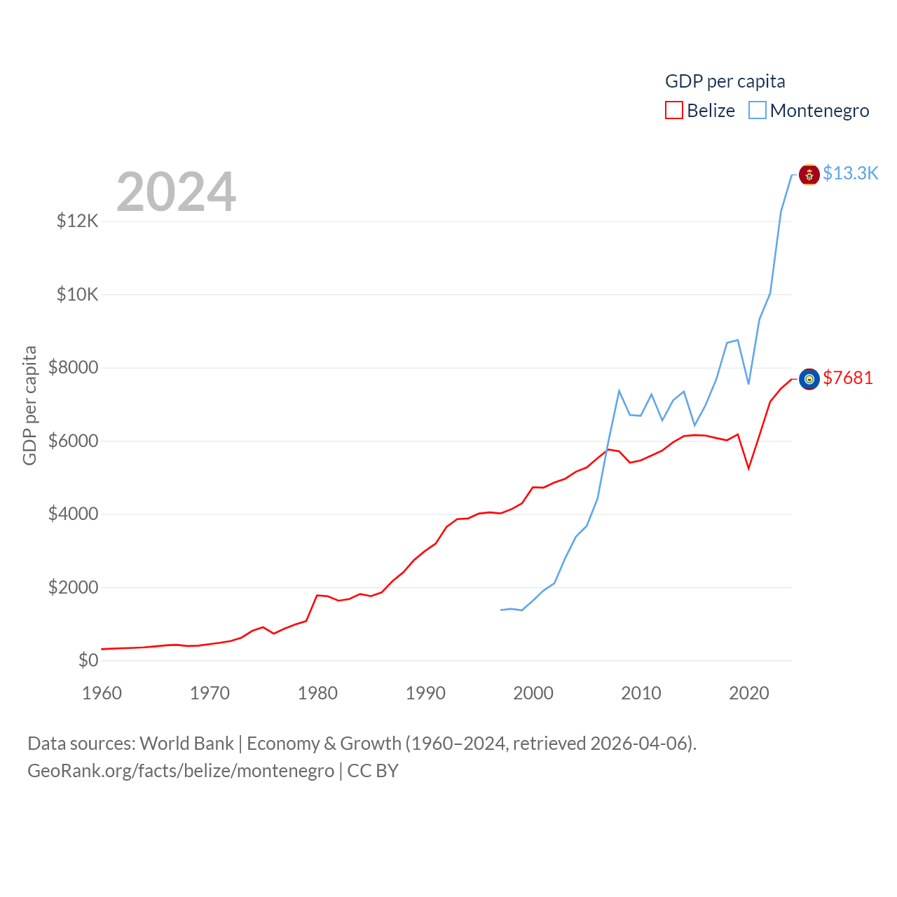 By GDP, Belize ranks 168/197 ($3.2B) and Montenegro ranks 155/197 ($8.27B). By GDP per capita, Belize ranks 98/197 ($7,681), while Montenegro ranks 77/197 ($13,263).