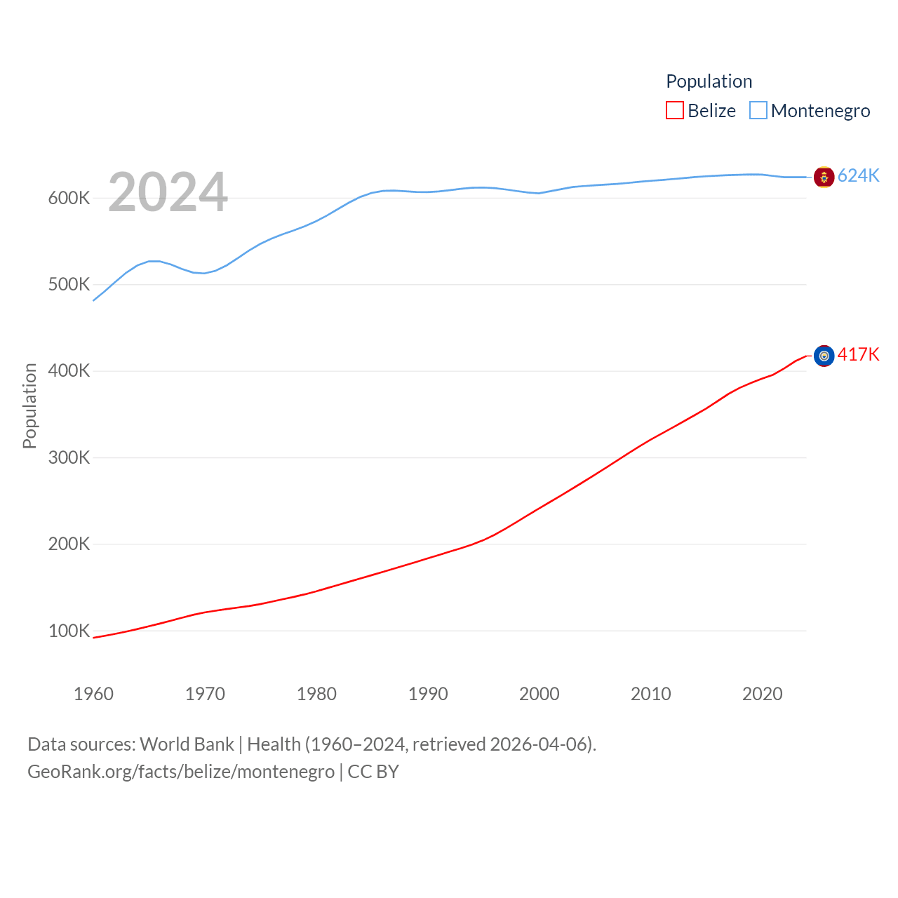 Belize has a population of 417K (ranked 171/197), compared with 624K in Montenegro (ranked 166/197). Belize's land area is 8,807 sq mi versus 5,193 sq mi for Montenegro (ranked 148th vs. 156th).