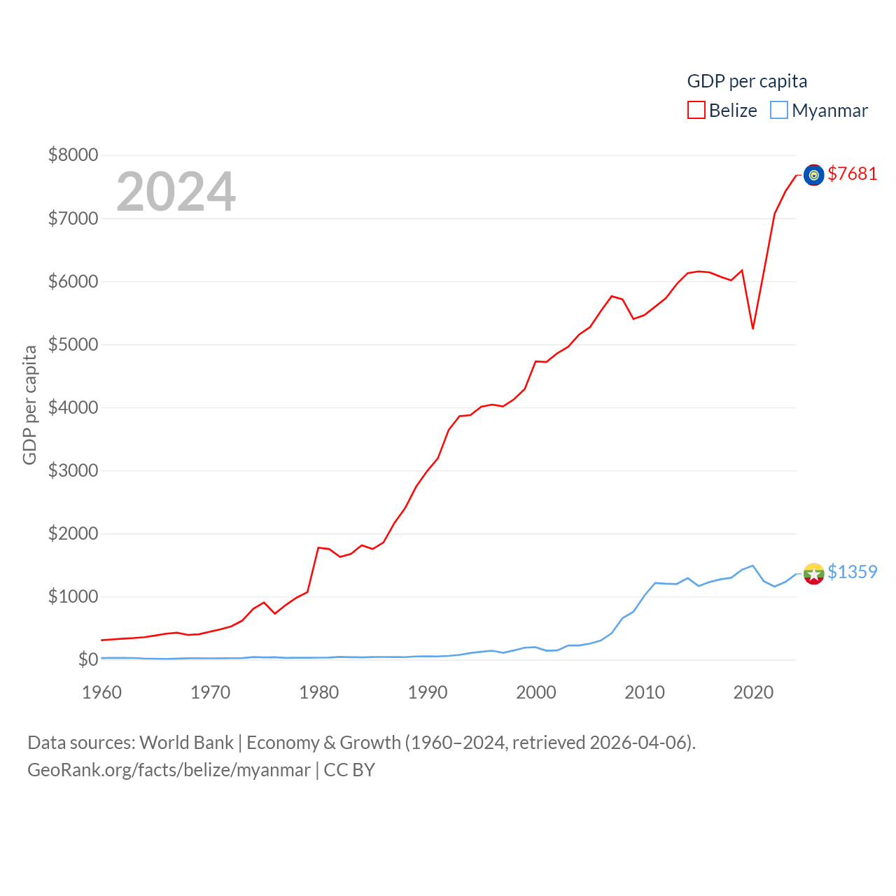 By GDP, Belize ranks 168/197 ($3.2B) and Myanmar ranks 85/197 ($74.1B). By GDP per capita, Belize ranks 98/197 ($7,681), while Myanmar ranks 165/197 ($1,359).
