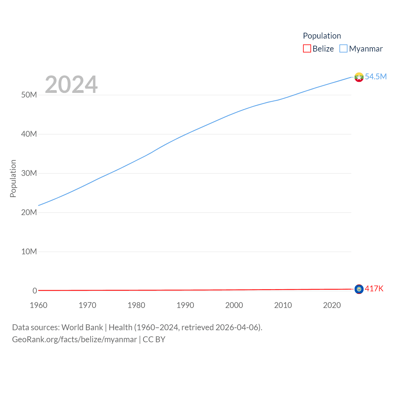 Belize has a population of 417K (ranked 171/197), compared with 54.5M in Myanmar (ranked 27/197). Belize's land area is 8,807 sq mi versus 251,997 sq mi for Myanmar (ranked 148th vs. 39th).