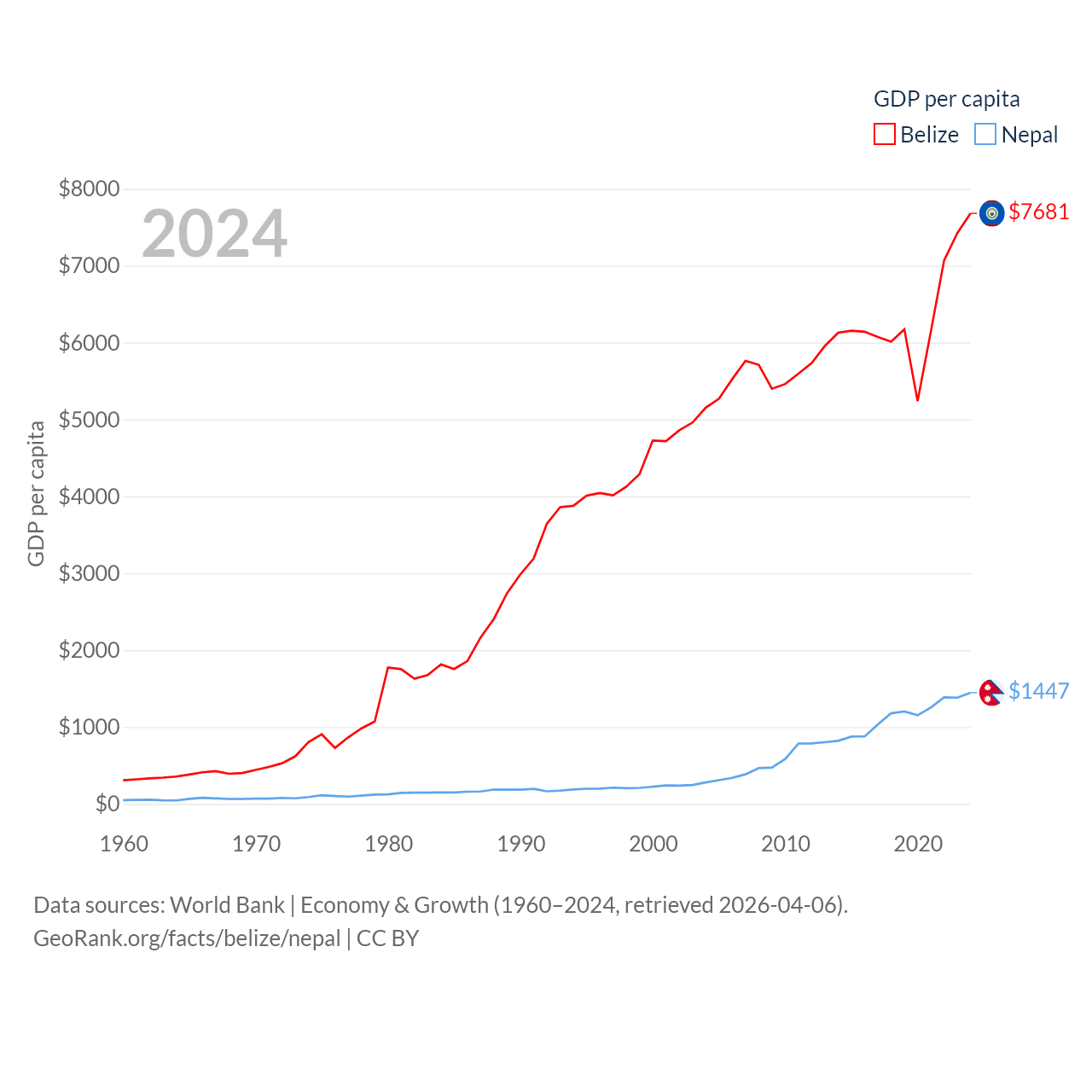 By GDP, Belize ranks 168/197 ($3.2B) and Nepal ranks 101/197 ($42.9B). By GDP per capita, Belize ranks 98/197 ($7,681), while Nepal ranks 164/197 ($1,447).