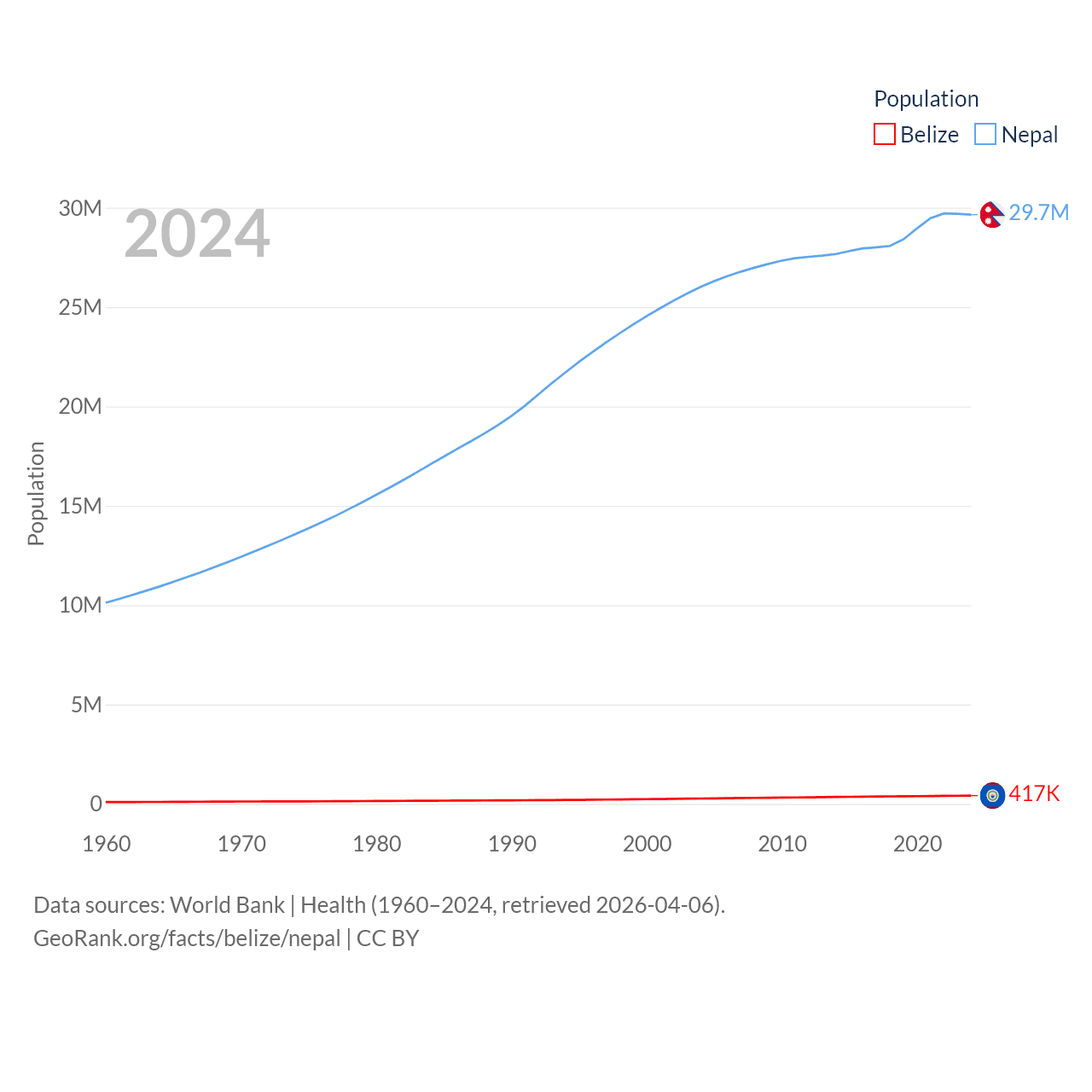 Belize has a population of 417K (ranked 171/197), compared with 29.7M in Nepal (ranked 51/197). Belize's land area is 8,807 sq mi versus 55,348 sq mi for Nepal (ranked 148th vs. 92nd).