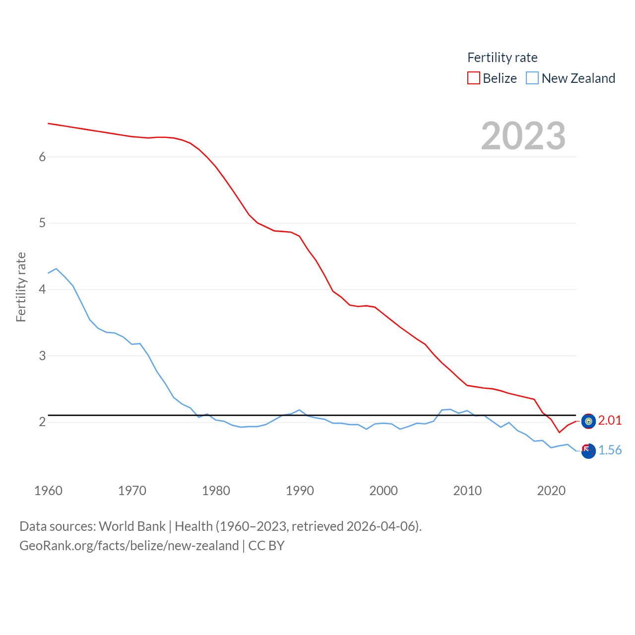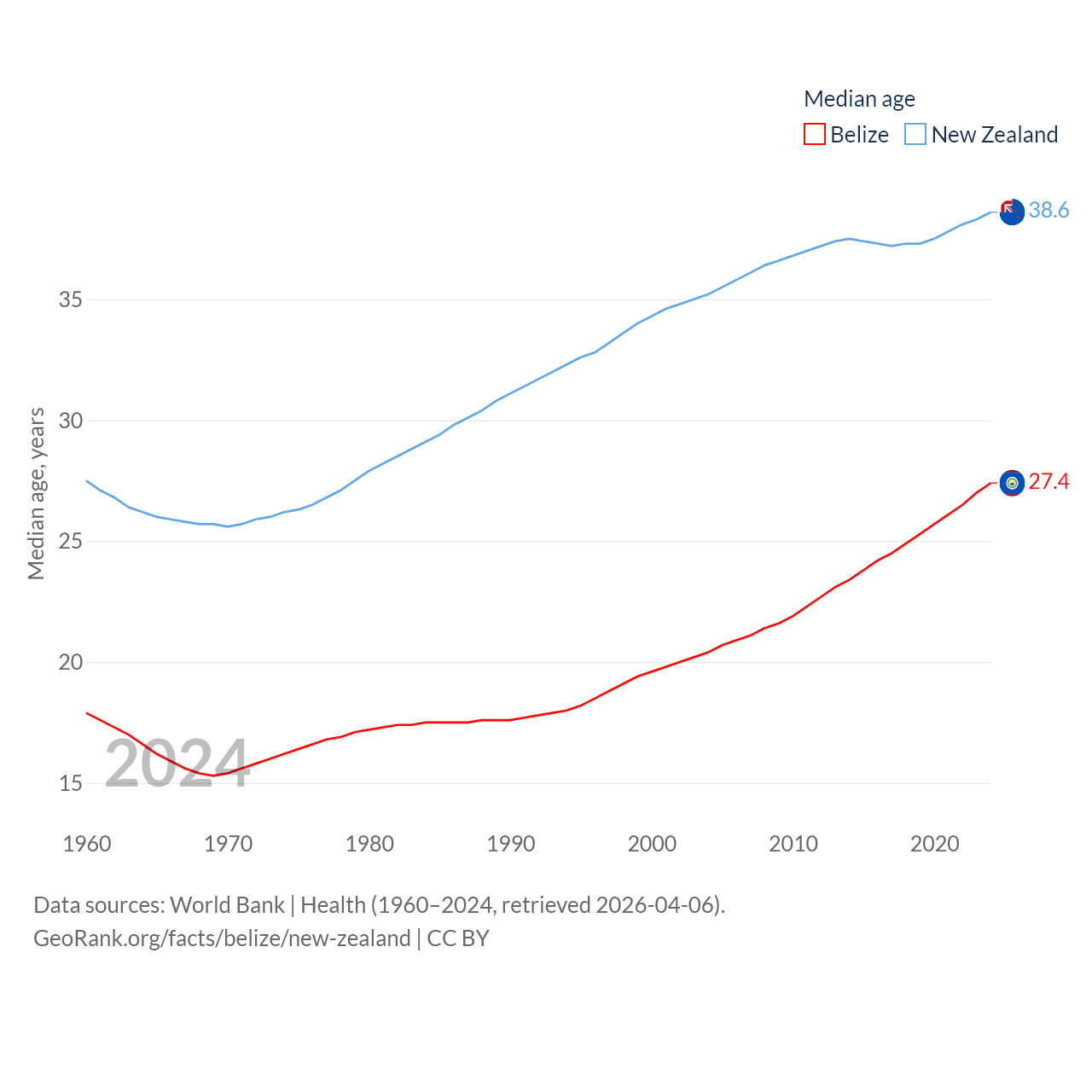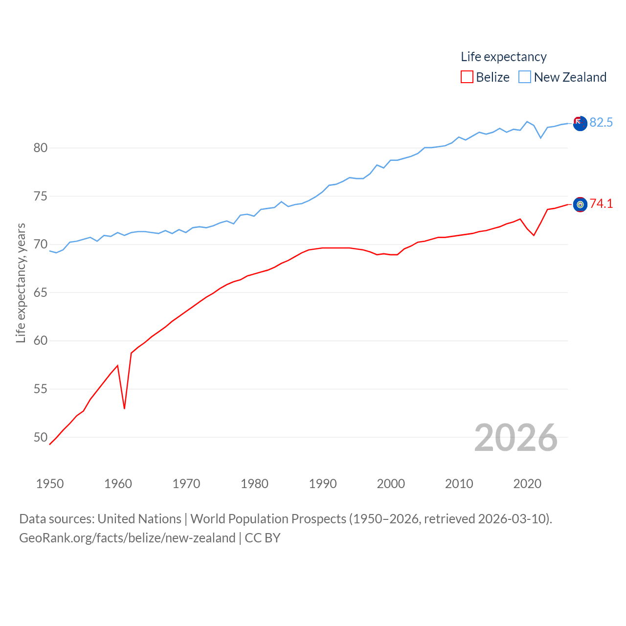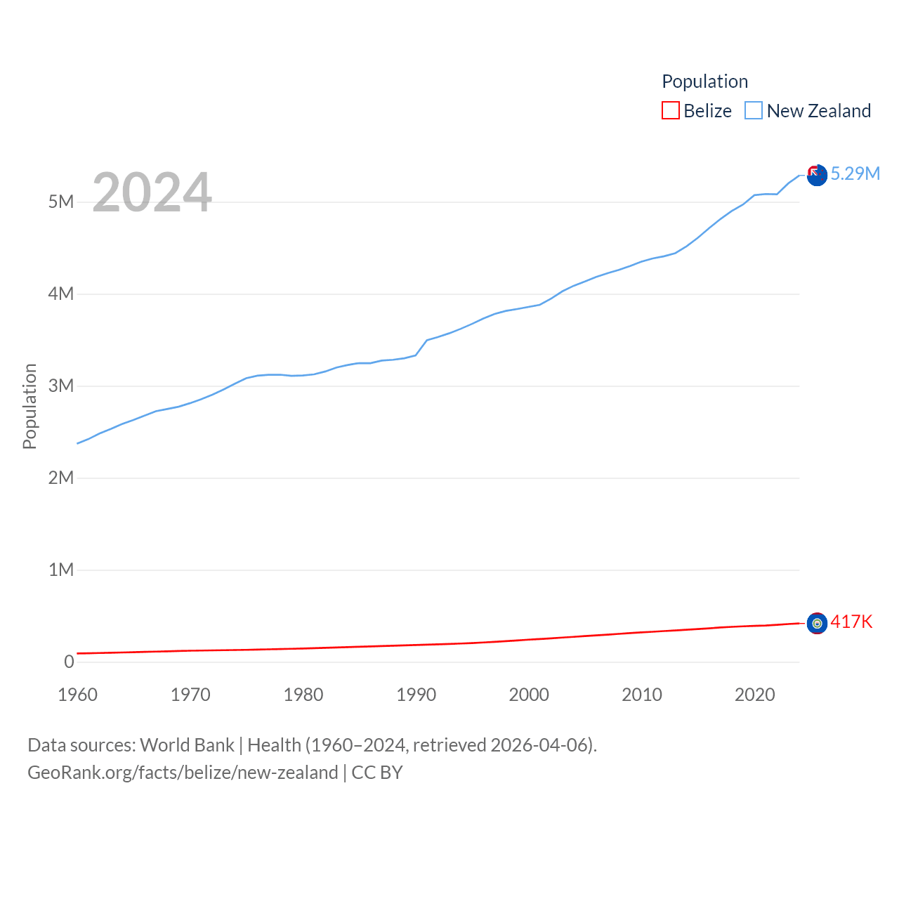 Belize has a population of 417K (ranked 171/197), compared with 5.29M in New Zealand (ranked 123/197). Belize's land area is 8,807 sq mi versus 101,665 sq mi for New Zealand (ranked 148th vs. 74th).
