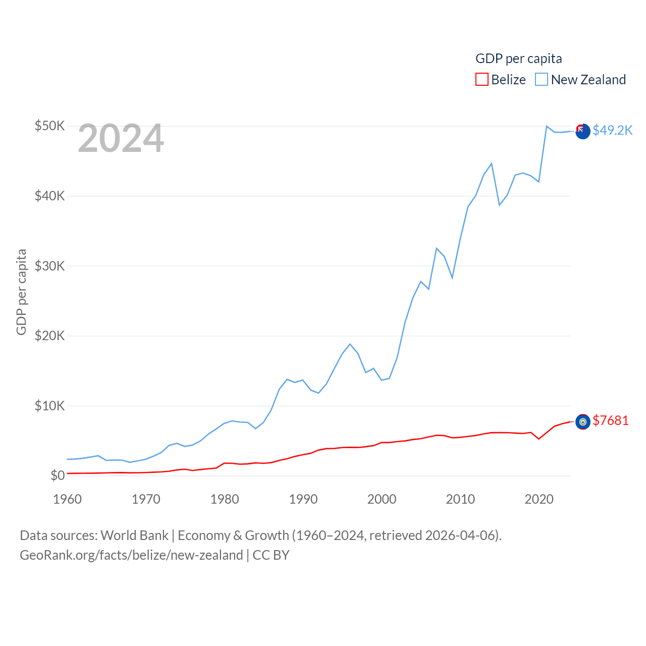 By GDP, Belize ranks 168/197 ($3.2B) and New Zealand ranks 52/197 ($260B). By GDP per capita, Belize ranks 98/197 ($7,681), while New Zealand ranks 26/197 ($49,205).