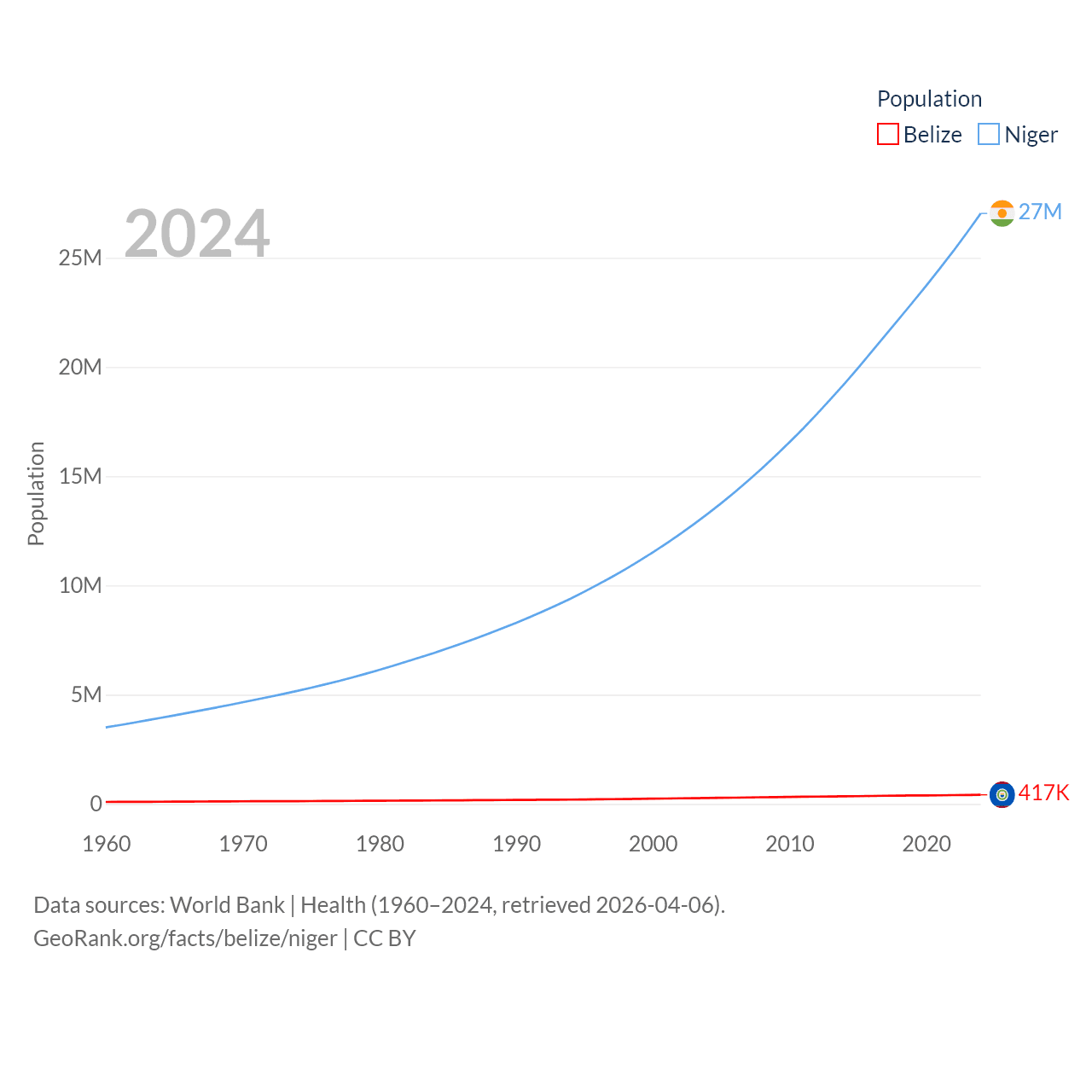 Belize has a population of 417K (ranked 171/197), compared with 27M in Niger (ranked 55/197). Belize's land area is 8,807 sq mi versus 489,076 sq mi for Niger (ranked 148th vs. 20th).