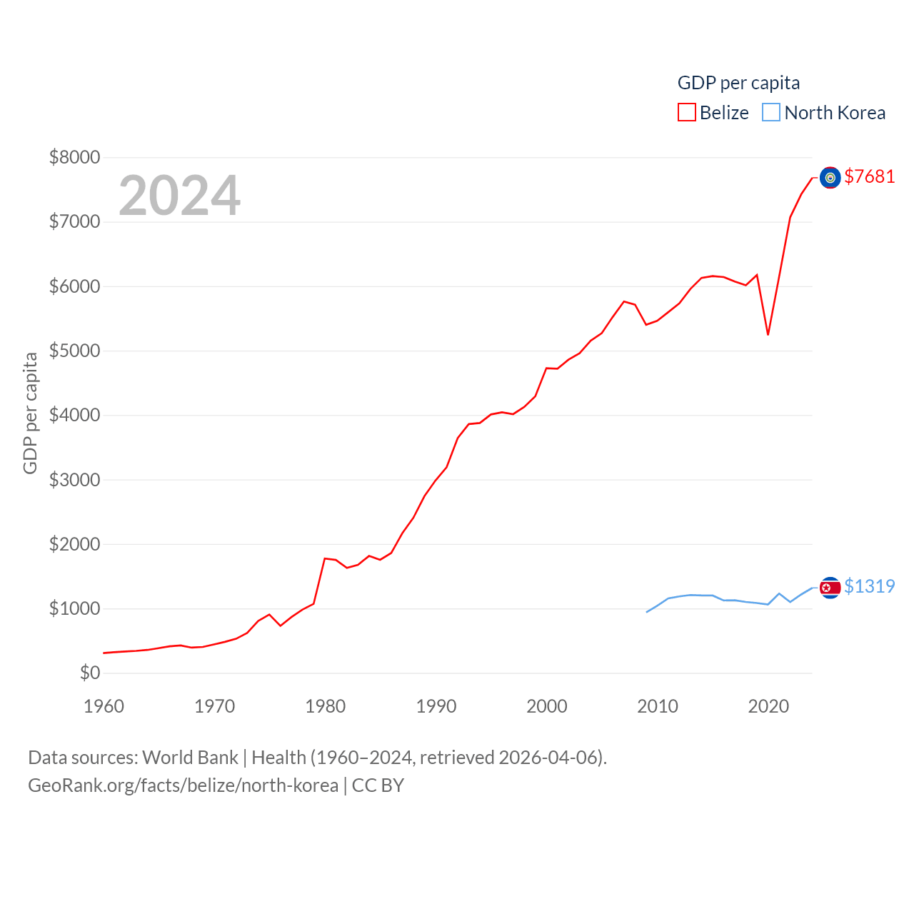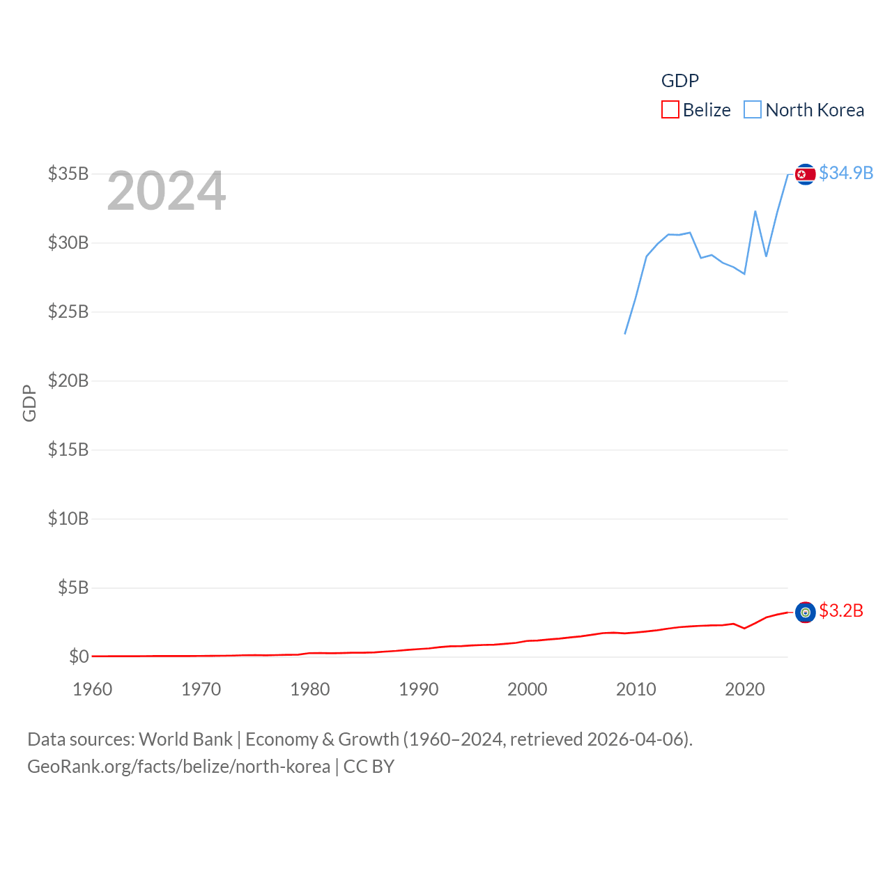 By GDP, Belize ranks 168/197 ($3.2B) and North Korea ranks 106/197 ($34.9B). By GDP per capita, Belize ranks 98/197 ($7,681), while North Korea ranks 168/197 ($1,319).