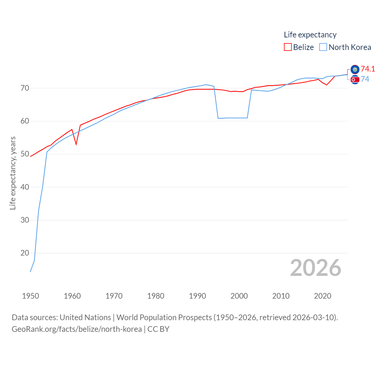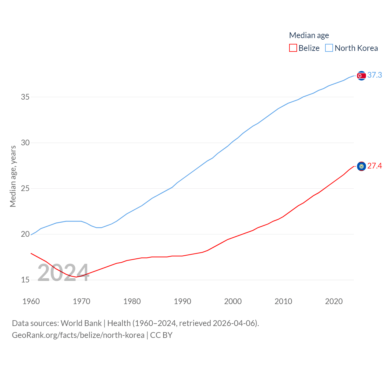 Belize has a population of 417K (ranked 171/197), compared with 26.5M in North Korea (ranked 56/197). Belize's land area is 8,807 sq mi versus 46,491 sq mi for North Korea (ranked 148th vs. 97th).