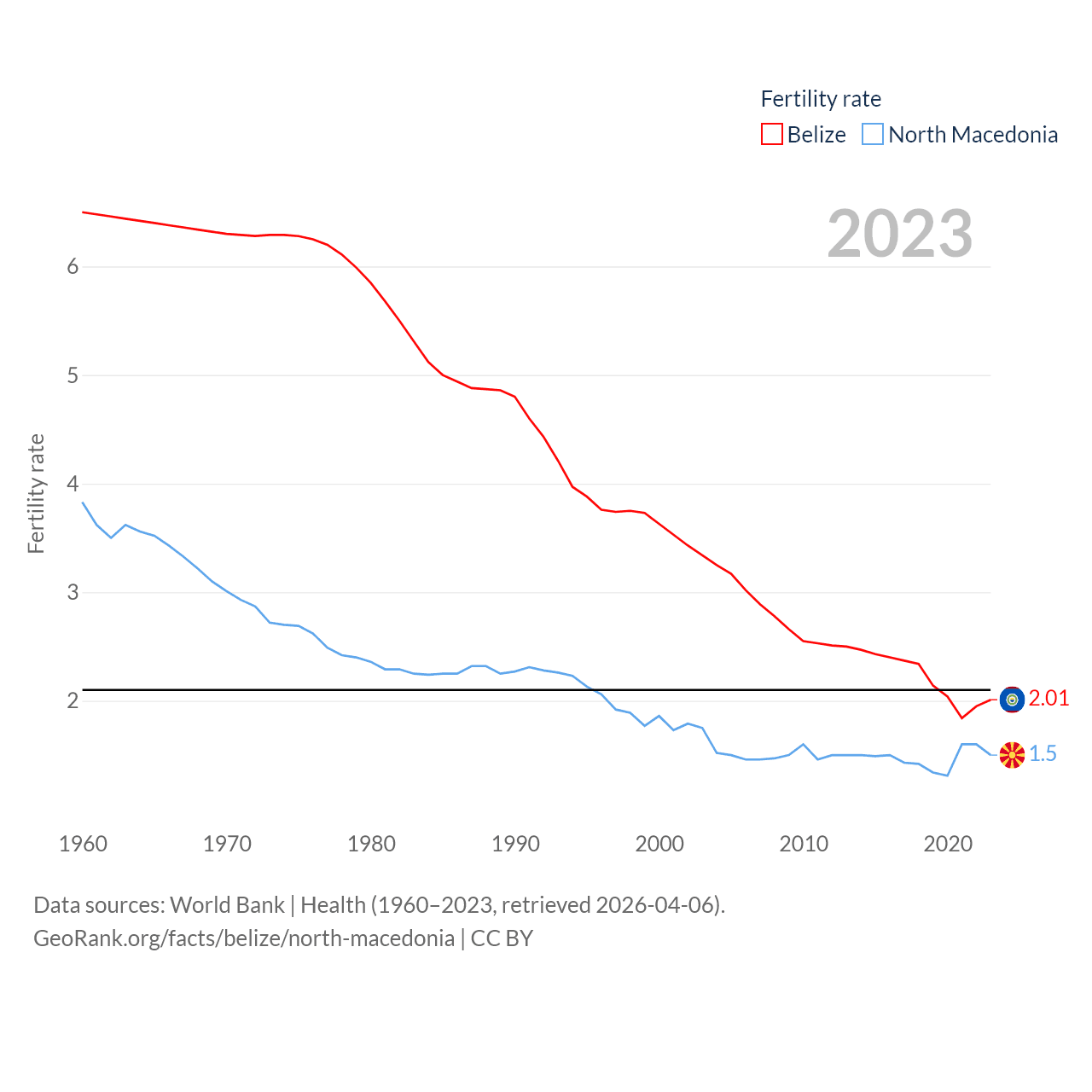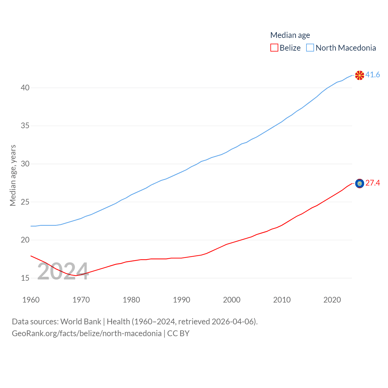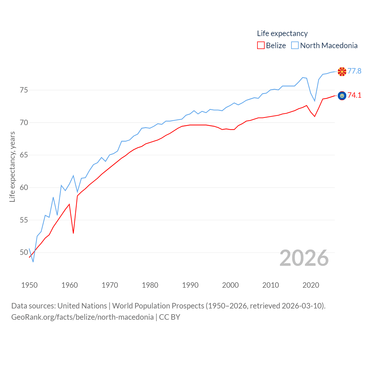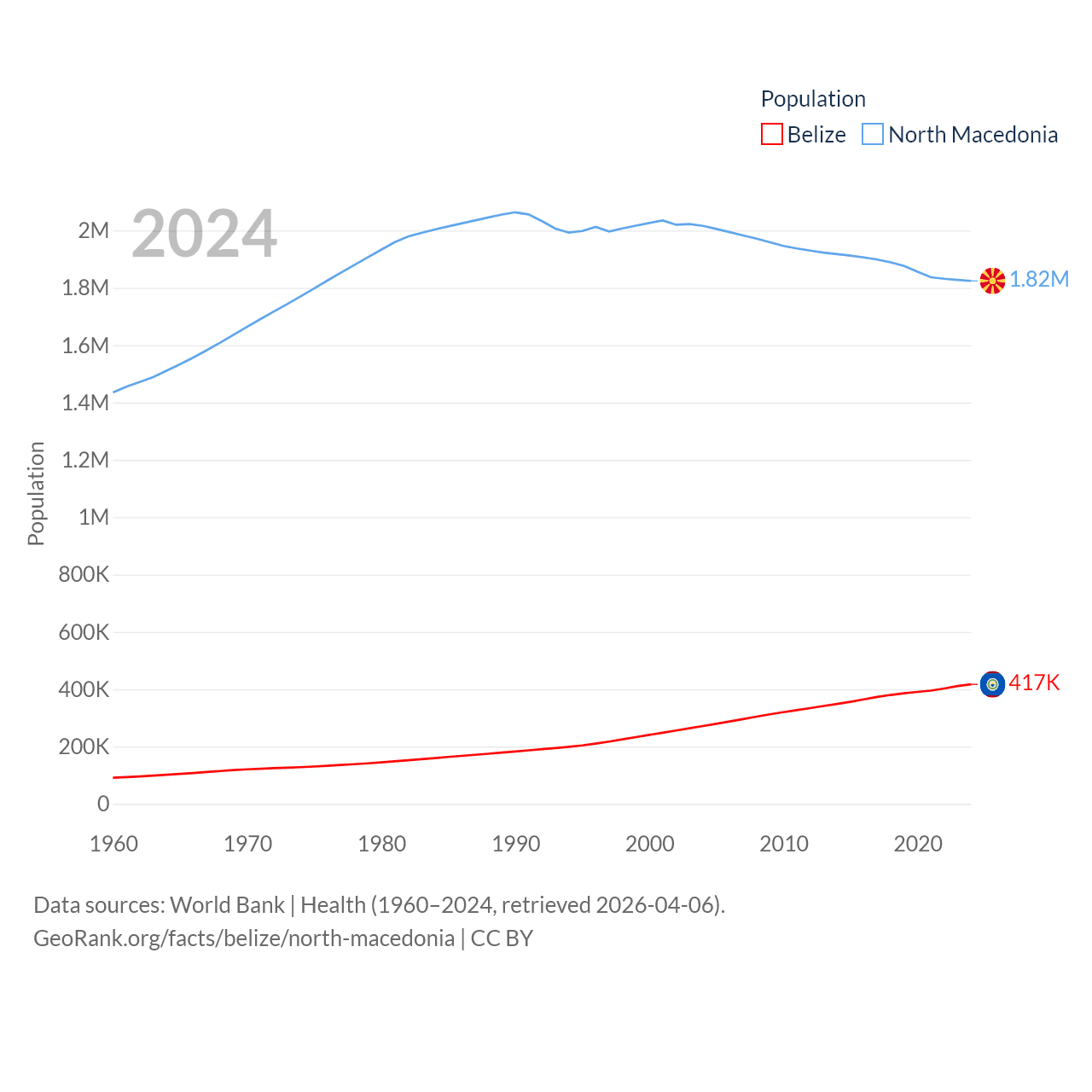 Belize has a population of 417K (ranked 171/197), compared with 1.82M in North Macedonia (ranked 150/197). Belize's land area is 8,807 sq mi versus 9,737 sq mi for North Macedonia (ranked 148th vs. 145th).