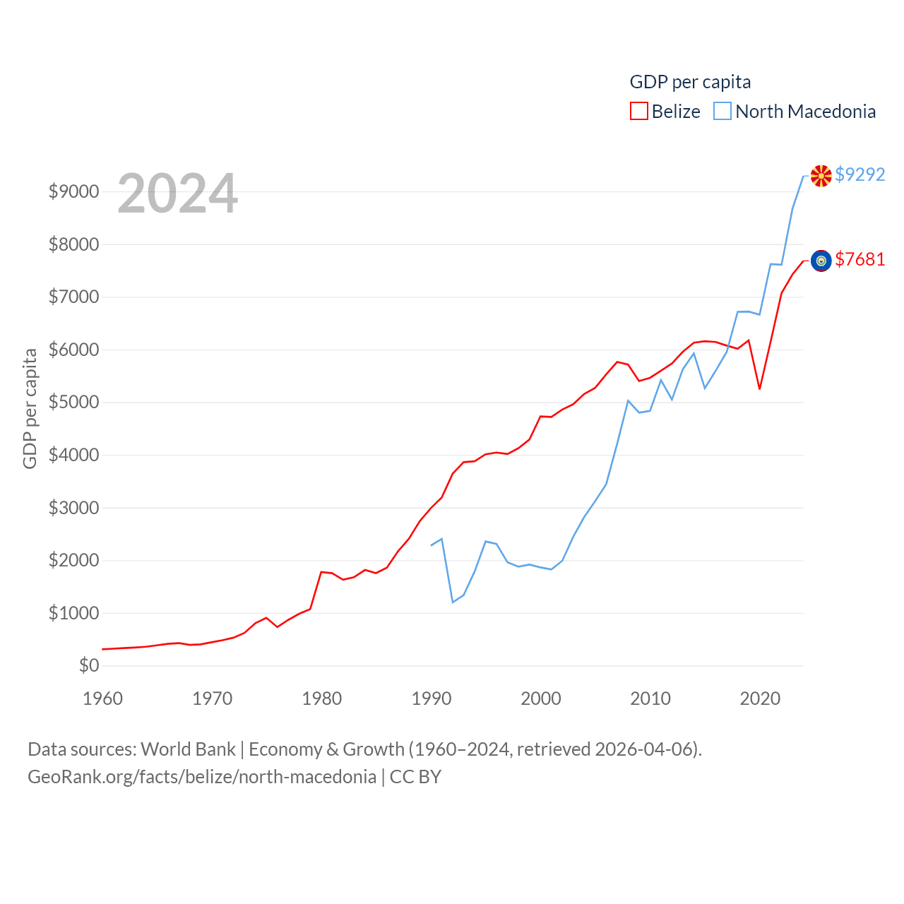 By GDP, Belize ranks 168/197 ($3.2B) and North Macedonia ranks 138/197 ($17B). By GDP per capita, Belize ranks 98/197 ($7,681), while North Macedonia ranks 88/197 ($9,292).