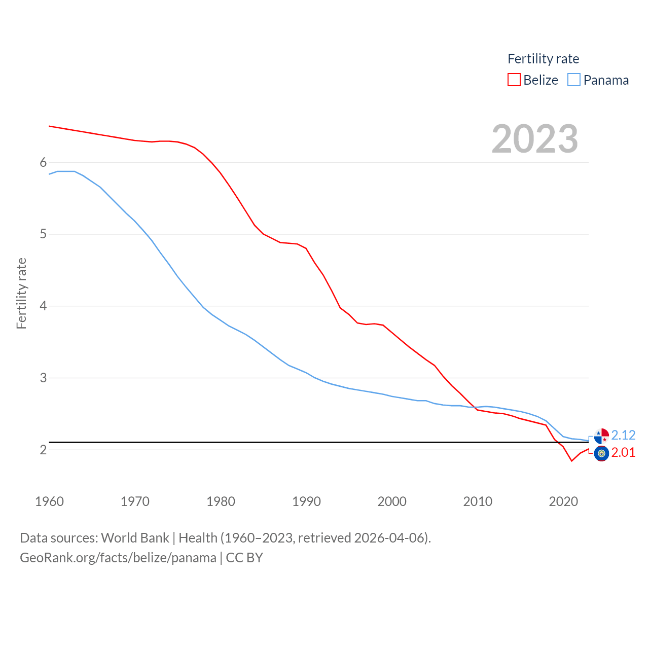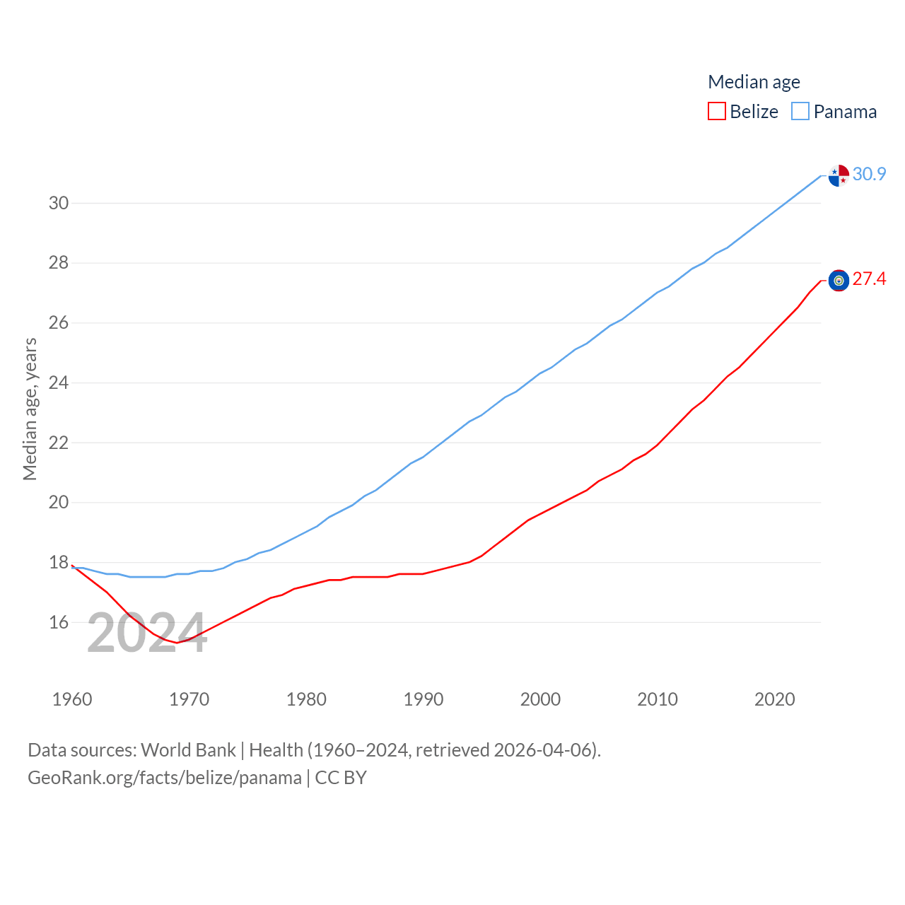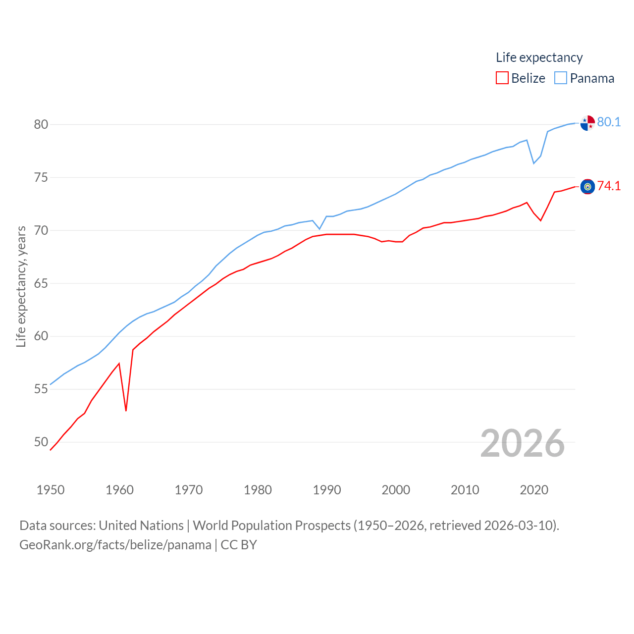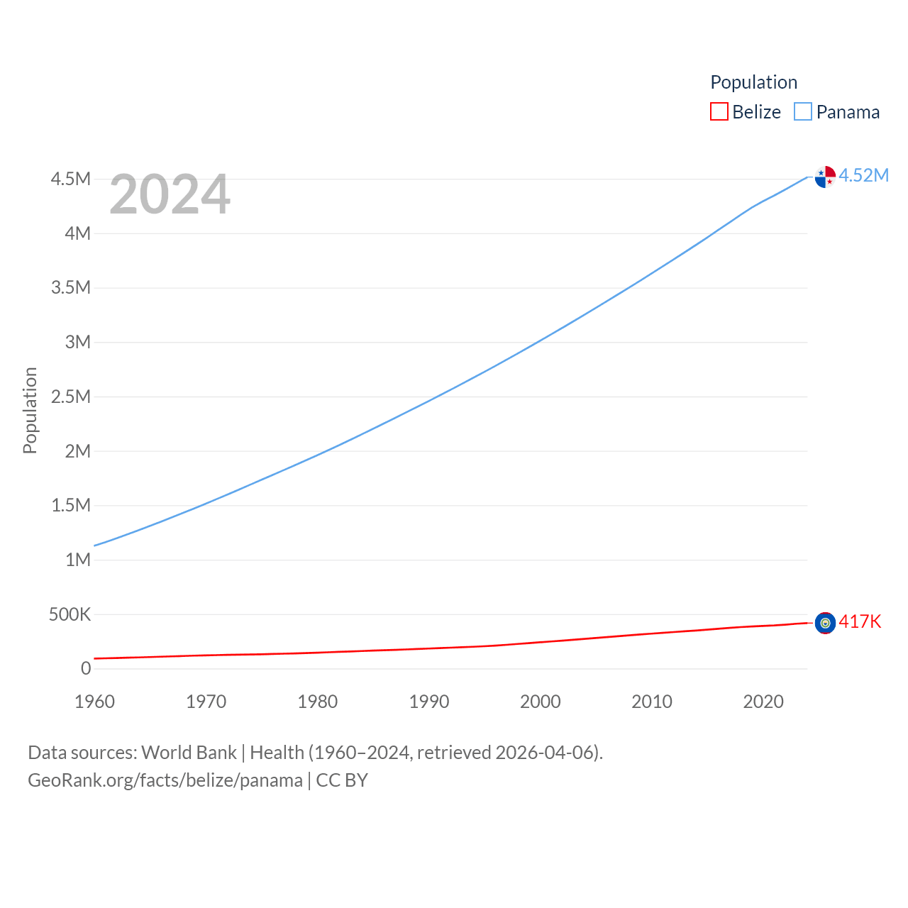 Belize has a population of 417K (ranked 171/197), compared with 4.52M in Panama (ranked 128/197). Belize's land area is 8,807 sq mi versus 28,641 sq mi for Panama (ranked 148th vs. 115th).