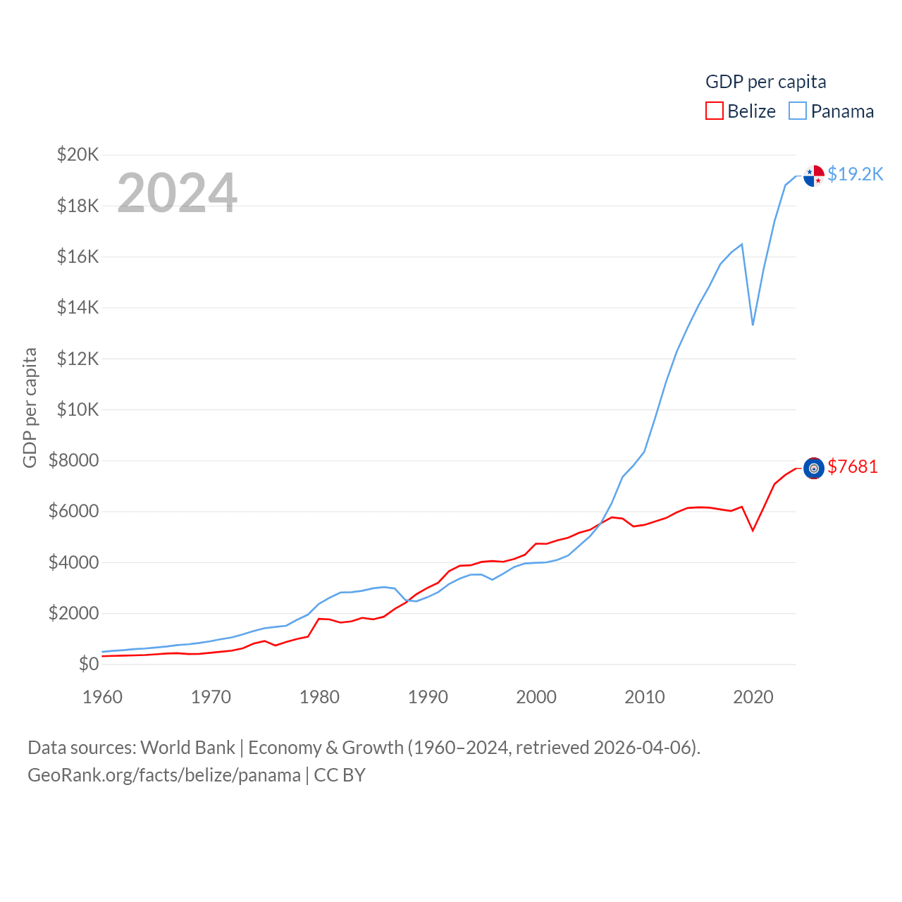 By GDP, Belize ranks 168/197 ($3.2B) and Panama ranks 78/197 ($86.5B). By GDP per capita, Belize ranks 98/197 ($7,681), while Panama ranks 60/197 ($19,161).
