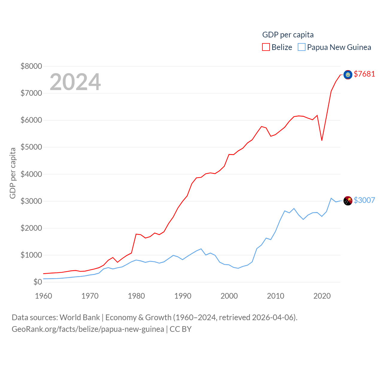 By GDP, Belize ranks 168/197 ($3.2B) and Papua New Guinea ranks 110/197 ($31.8B). By GDP per capita, Belize ranks 98/197 ($7,681), while Papua New Guinea ranks 140/197 ($3,007).