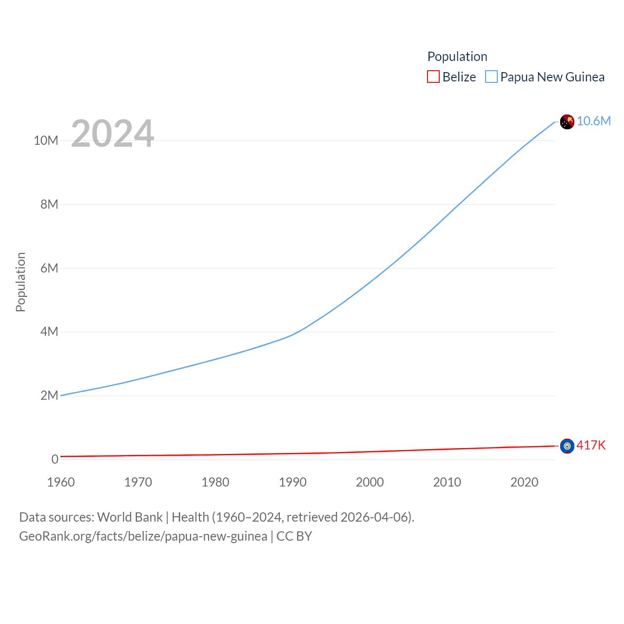 Belize has a population of 417K (ranked 171/197), compared with 10.6M in Papua New Guinea (ranked 92/197). Belize's land area is 8,807 sq mi versus 174,850 sq mi for Papua New Guinea (ranked 148th vs. 54th).