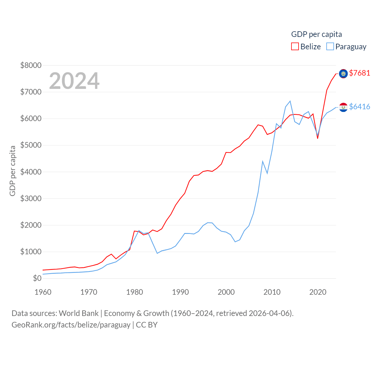 By GDP, Belize ranks 168/197 ($3.2B) and Paraguay ranks 98/197 ($44.5B). By GDP per capita, Belize ranks 98/197 ($7,681), while Paraguay ranks 109/197 ($6,416).