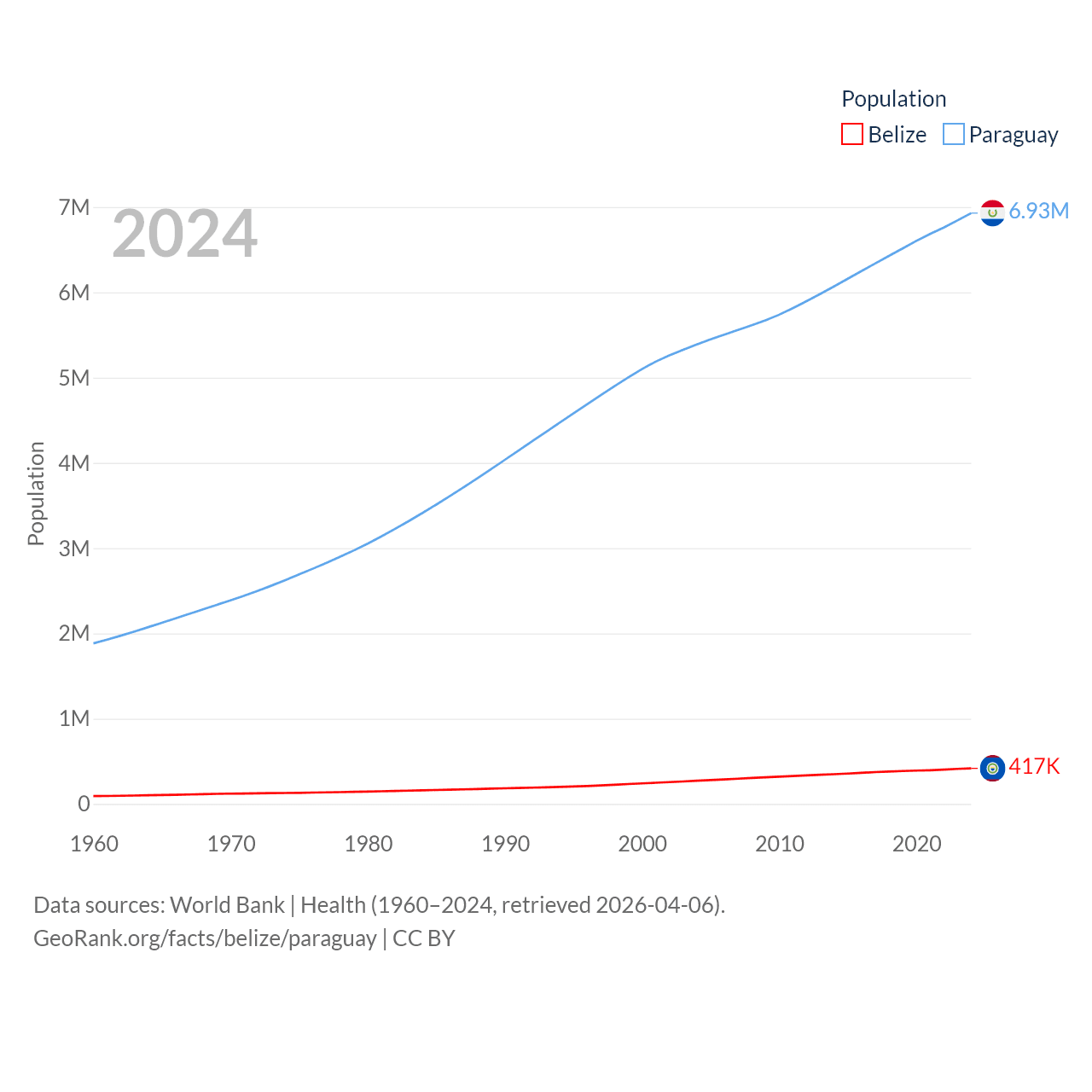 Belize has a population of 417K (ranked 171/197), compared with 6.93M in Paraguay (ranked 107/197). Belize's land area is 8,807 sq mi versus 152,901 sq mi for Paraguay (ranked 148th vs. 59th).