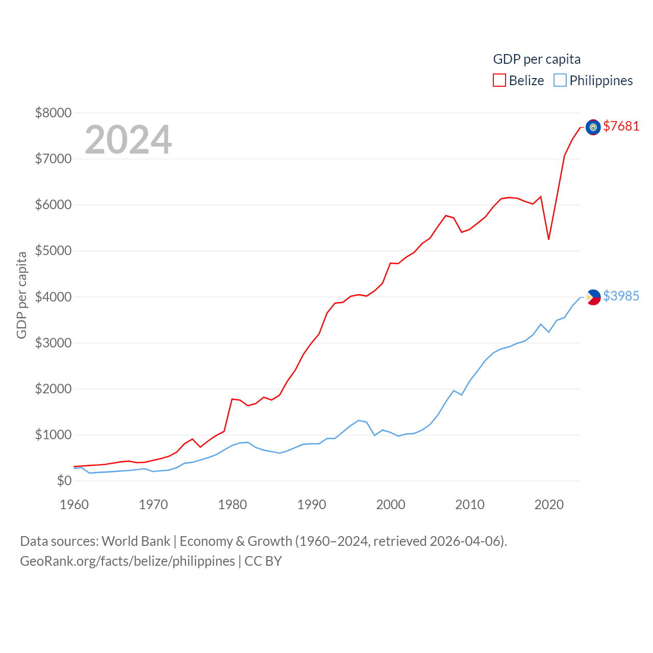 By GDP, Belize ranks 168/197 ($3.2B) and The Philippines ranks 35/197 ($462B). By GDP per capita, Belize ranks 98/197 ($7,681), while The Philippines ranks 130/197 ($3,985).