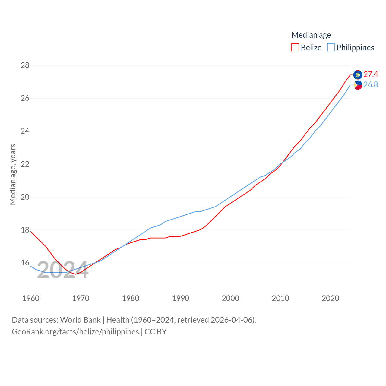 Belize has a population of 417K (ranked 171/197), compared with 116M in The Philippines (ranked 14/197). Belize's land area is 8,807 sq mi versus 115,124 sq mi for The Philippines (ranked 148th vs. 71st).