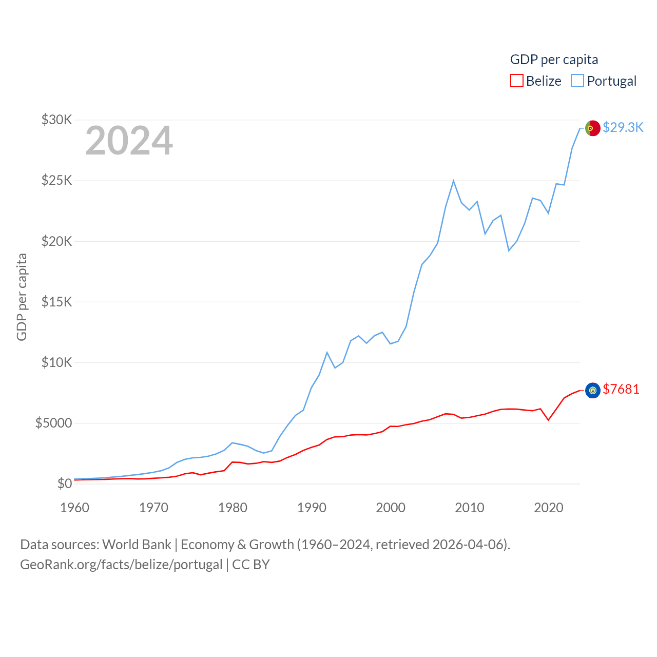 By GDP, Belize ranks 168/197 ($3.2B) and Portugal ranks 46/197 ($313B). By GDP per capita, Belize ranks 98/197 ($7,681), while Portugal ranks 44/197 ($29,292).