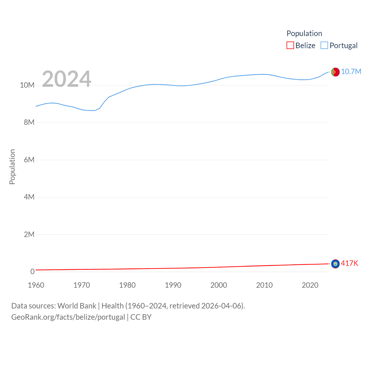 Belize has a population of 417K (ranked 171/197), compared with 10.7M in Portugal (ranked 90/197). Belize's land area is 8,807 sq mi versus 35,369 sq mi for Portugal (ranked 148th vs. 108th).